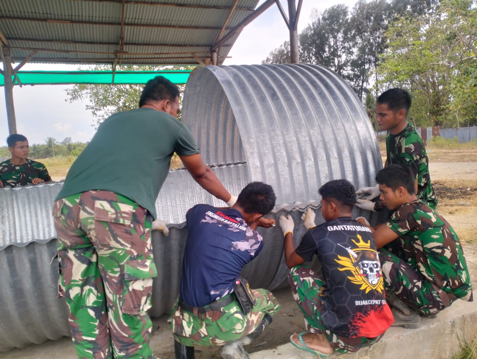 Fokus pekerjaan meliputi perakitan rangka pipa baja bergelombang (Aramco) dan penyiapan pondasi alas jembatan. Para prajurit bekerja bahu-membahu dengan penuh semangat dan ketelitian meski dihadapkan pada medan yang cukup menantang.