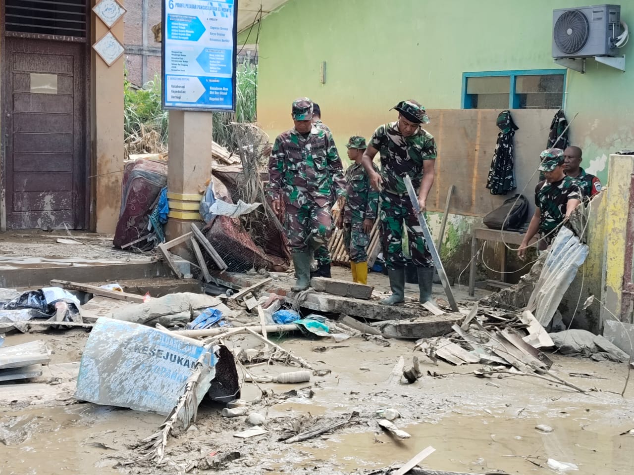 Personel Koramil bekerja sama dengan pihak sekolah, perangkat desa, serta masyarakat setempat. Mereka membersihkan ruang kelas, mengangkut lumpur, mencuci perabotan, dan merapikan halaman sekolah menggunakan peralatan manual maupun sarana pendukung lainnya.