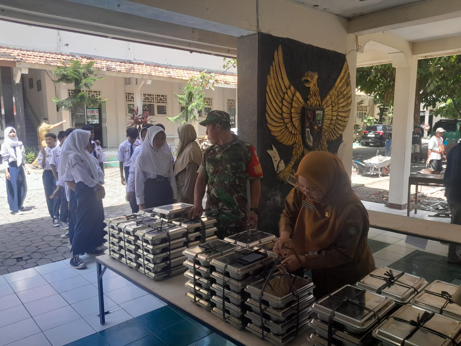 Babinsa Joyotakan Koramil 03/Serengan Kodim 0735/Surakarta Serka Sudiyono melaksanakan Pendampingan pendistribusian Makan Bergizi Gratis (MBG) di SMP Islam Bakti Jl. Wahid Hasim Rt 03 Rw 01 Joyotakan Serengan Kota Surakarta, Kamis Pukul 10.00 Wib (27/11/2025).