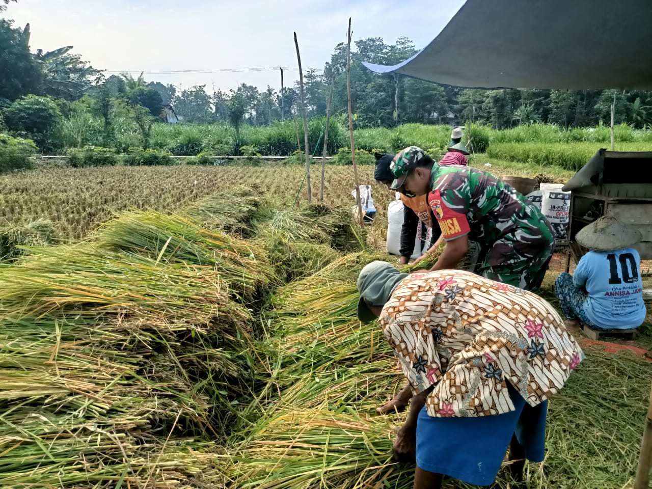 Babinsa Desa Selokajang Koramil 0808/06 Srengat Kodim 0808/Blitar, Sertu Dwi Cahyo Nofarid, melaksanakan kegiatan pendampingan ketahanan pangan (hanpangan) dengan membantu panen padi di lahan sawah milik Bapak Hadi anggota Poktan Gema Usaha 1 Dusun Maron RT. 01 RW. 01 Desa Selokajang Kecamatan Srengat Kabupaten Blitar, Kamis (21/8/2025).