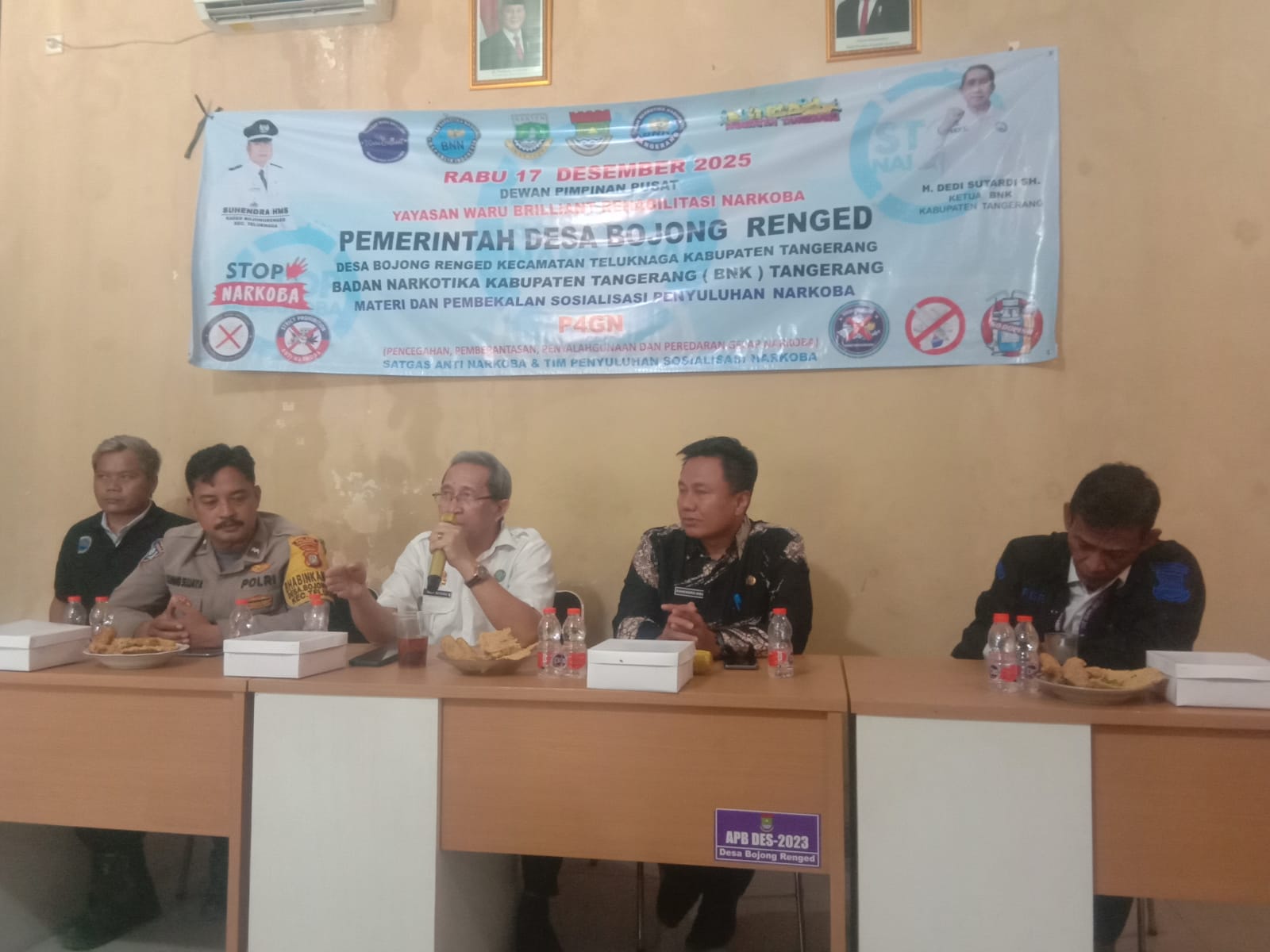 Bertempat di Aula Kantor desa Bojong Renged Kecamatan teluknaga. Acara yang di mulai pukul. 09.30 Wib. Tamu undangan yang hadir Sekretaris Camat “Ferry” Kepala Desa Bojong Renged “Suhendra HMS,.SH.”sekaligus Ketua Umum yayasan waru brilliant Rehabilitasi Narkoba, Sekretaris Desa sekaligus pengurus yayasan waru brilliant Rehabilitasi Narkoba “Mahfud Eki Syawira”, Sebagai narasumber Ketua BNK Kabupaten Tangerang H.Dedi Sutardi SH.