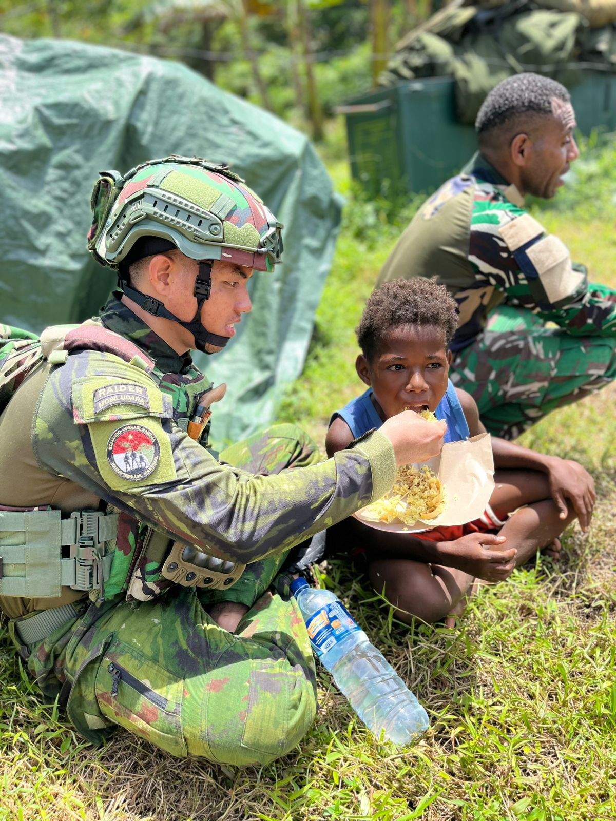 Suasana ceria dan penuh kebersamaan tampak jelas saat prajurit TNI berbaur dengan anak-anak, berbagi makanan, serta menikmati momen makan bersama. Tawa dan senyum polos anak-anak Kampung Kolam menjadi gambaran keberhasilan pendekatan humanis yang dilakukan Satgas Yonif 300/Brajawijaya dalam membangun rasa aman dan kepercayaan masyarakat, khususnya generasi muda di wilayah penugasan.