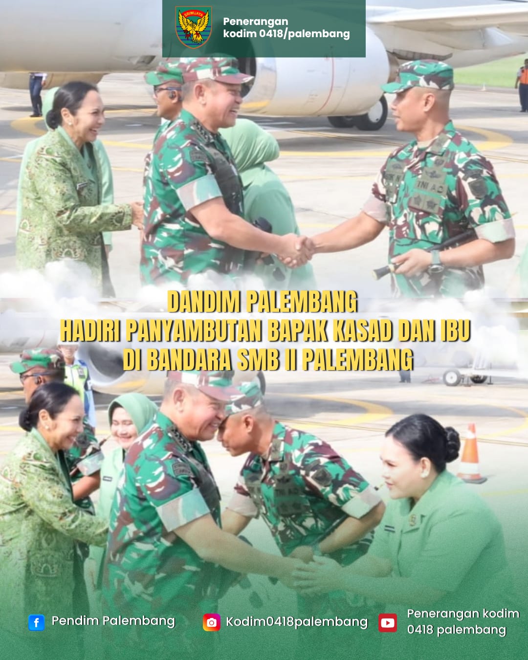Dalam rangka kunjungan kerja Kepala Staf Angkatan Darat (Kasad) Jenderal TNI Maruli Simanjuntak, M.Sc, Komandan Kodim 0418/Palembang Letkol Arh Erik Novianto, S.Sos turut mendampingi Pangdam II/Sriwijaya Mayjen TNI Ujang Darwis,M.D.A dan Danrem 044/Gapo Brigjen TNI Adri Koesdianto dalam kegiatan penyambutan di Bandara Sultan Mahmud Badaruddin II Palembang, Rabu(5/11/2025).