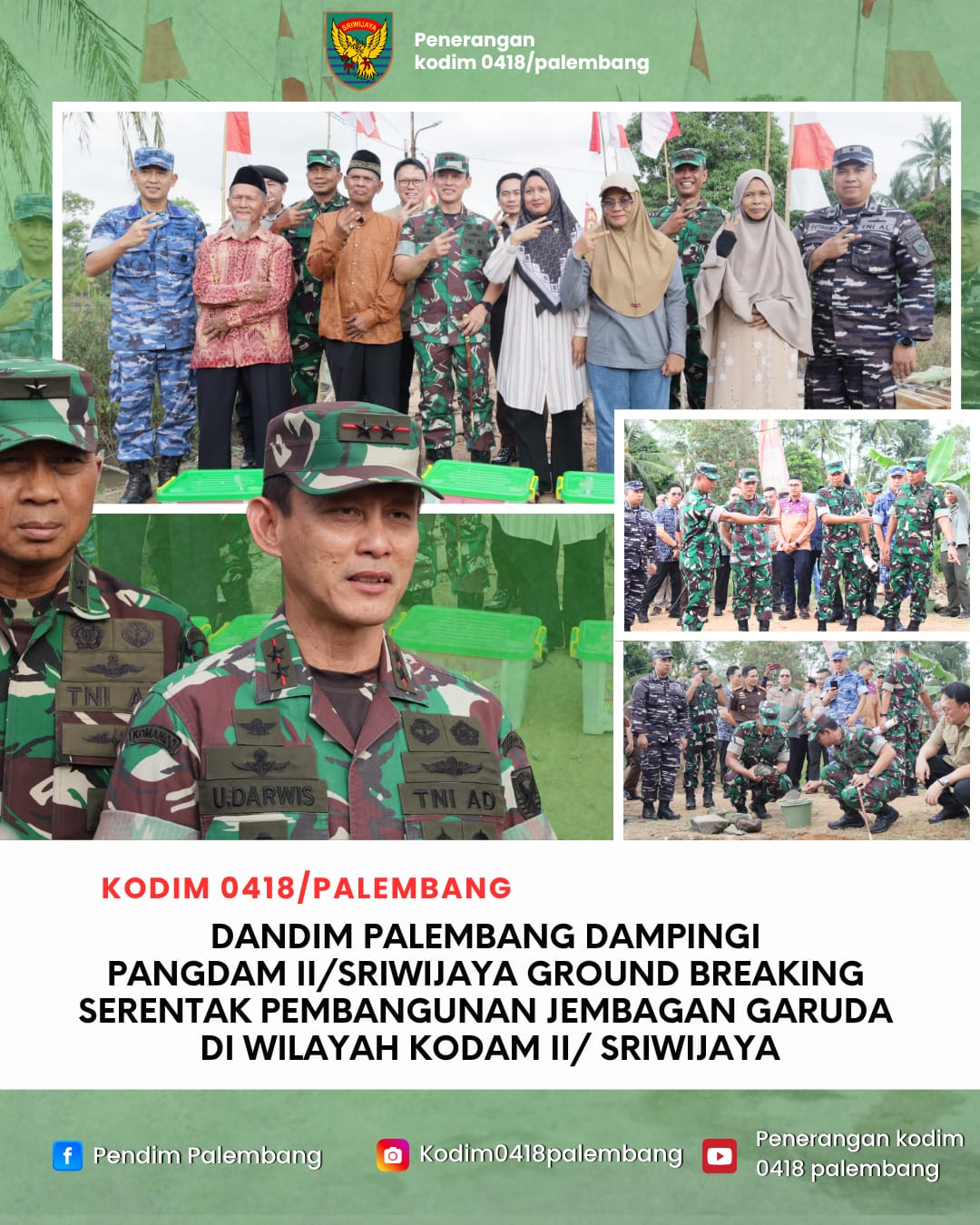 Komandan Kodim 0418/Palembang, Letkol Arh Erik Novianto, S.Sos., mendampingi Pangdam II/Sriwijaya Mayjen TNI Ujang Darwis, M.D.A., dalam kegiatan ground breaking pembangunan jembatan beton Tahap IV yang dilaksanakan secara serentak di seluruh jajaran Kodam II/Sriwijaya, Kamis (26/03/2026).