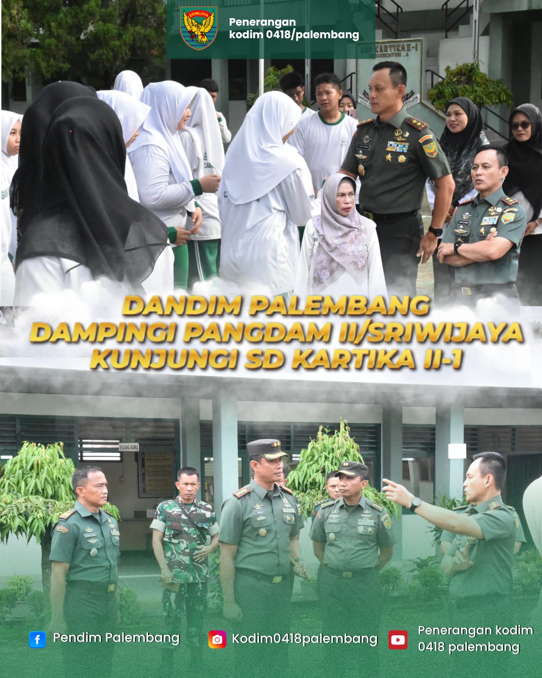 Komandan Kodim 0418/Palembang Letkol Arh Erik Novianto, S.Sos mendampingi Pangdam II/Sriwijaya Mayjen TNI Ujang Darwis, M.D.A dalam kunjungan kerja ke SD Kartika II-1, yang berlokasi di Jalan Ratu Sianum, Kelurahan 3 Ilir, Kecamatan Ilir Timur II, Kota Palembang, Selasa (22/10/2025).