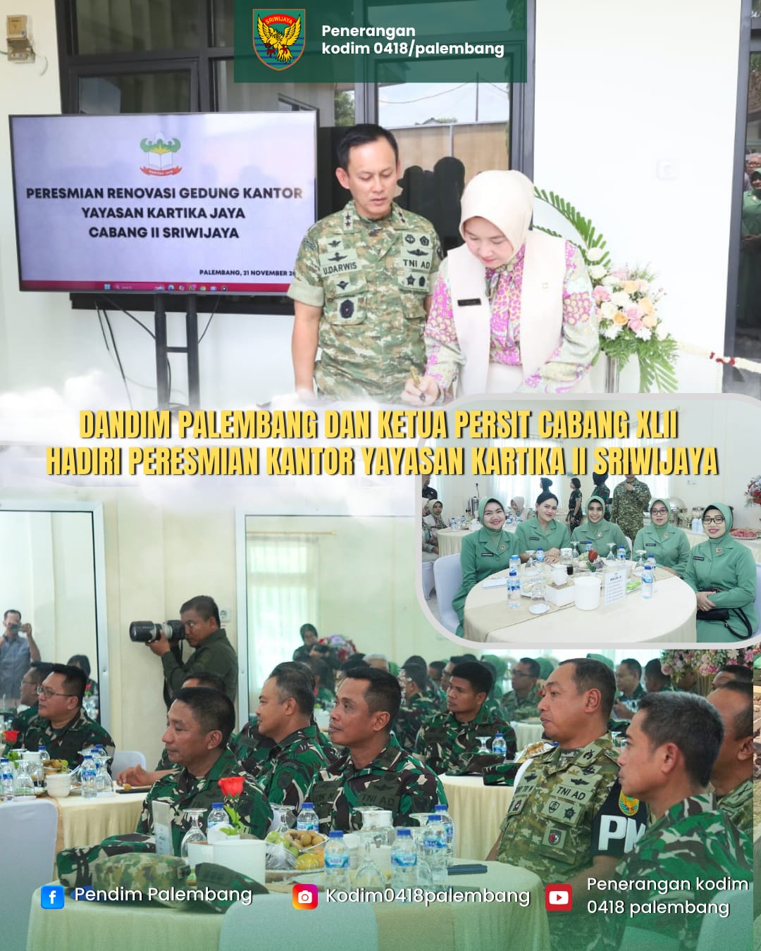 Pada Jumat (21/11/2025) pukul 10.00 WIB, Dandim 0418/Palembang Letkol Arh Erik Novianto, S.Sos menghadiri peresmian Kantor Yayasan Kartika Jaya Cabang II Sriwijaya. Kegiatan berlangsung di Aula Persit Kartika Chandra Kirana Cabang II Sriwijaya, Jalan Manunggal, Kelurahan 30 Ilir, Kecamatan Ilir Barat II Palembang.