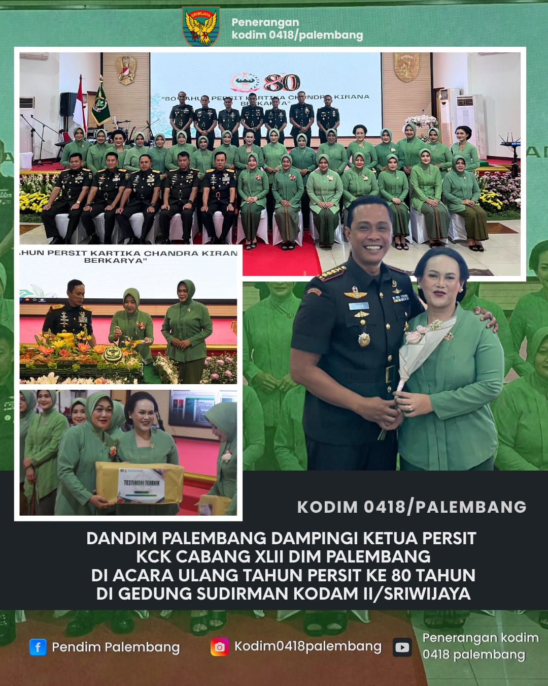 Komandan Kodim (Dandim) 0418/Palembang, Kolonel Arh Erik Novianto,S.sos hadir Dampingi Ketua Persit KCK Cabang XLII Dim Palembang Ny.Hayu Erik Novianto di Acara Peringatan Hari Ulang Tahun (HUT) ke-80 Persit Kartika Chandra Kirana yang digelar di Gedung Sudirman Kodam II/Sriwijaya.