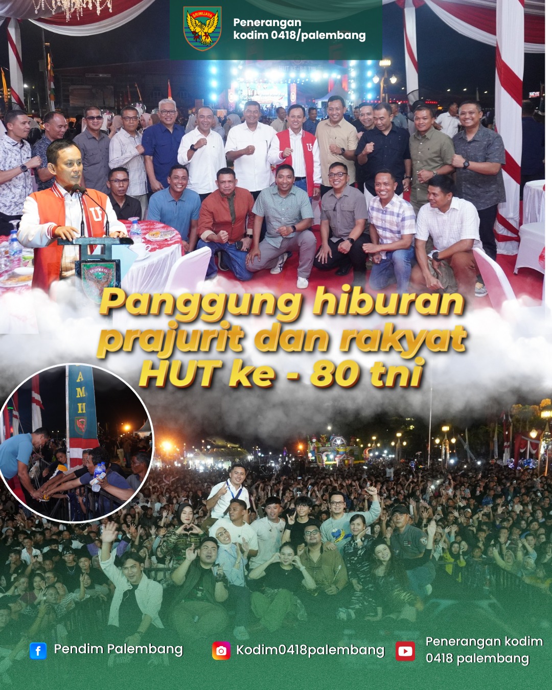 Dalam rangka memperingati Hari Ulang Tahun (HUT) ke-80 Tentara Nasional Indonesia (TNI) tahun 2025, Kodam II/Sriwijaya menggelar Panggung Hiburan Prajurit dan Rakyat di pelataran Benteng Kuto Besak (BKB) Palembang, Sabtu malam (18/10/2025). Acara yang berlangsung meriah ini dihadiri sekitar seribu orang dari unsur TNI, Polri, Forkopimda, serta masyarakat Kota Palembang.