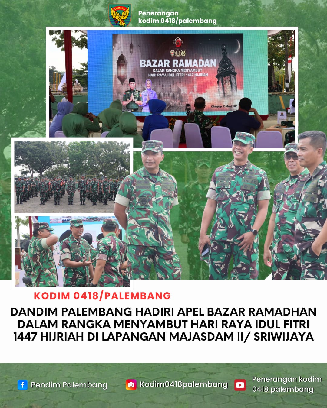 Komandan Kodim 0418/Palembang, Letkol Arh Erik Novianto,S.Sos , menghadiri apel pembukaan Bazar Ramadan dalam rangka menyambut Hari Raya Idul Fitri 1447 Hijriah yang digelar di Lapangan Majasdam II/Sriwijaya, Kota Palembang.