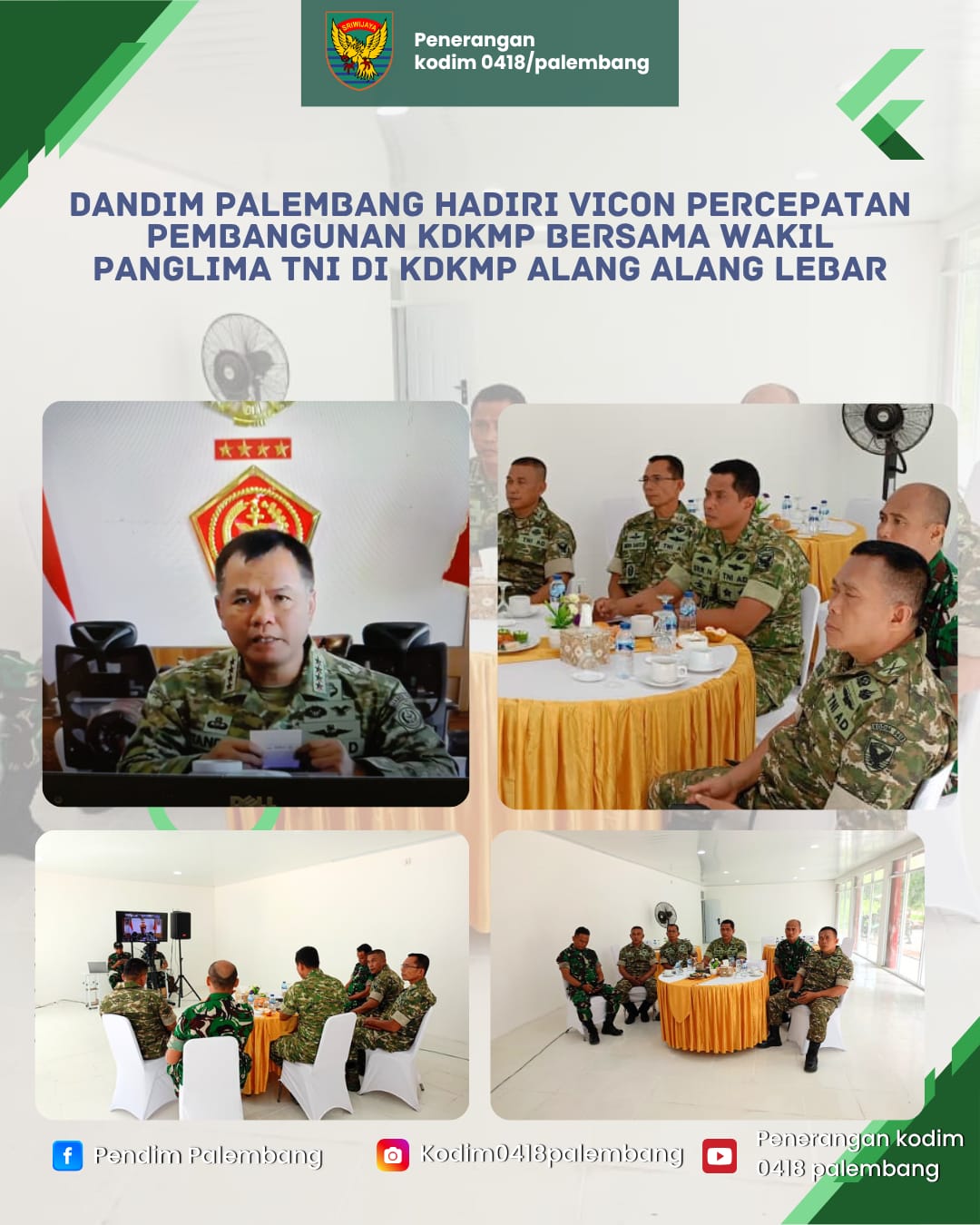 Komandan Kodim 0418/Palembang, Kolonel Arh Erik Novianto, S.sos, mengikuti kegiatan video conference (vicon) percepatan pembangunan Koperasi Desa/Kelurahan Merah Putih (KDKMP) bersama Wakil Panglima TNI, Jenderal TNI Tandyo Budi Revita, Selasa (7/4/2026) pukul 09.00 WIB di Ruang KDKMP Alang-Alang Lebar, Palembang.