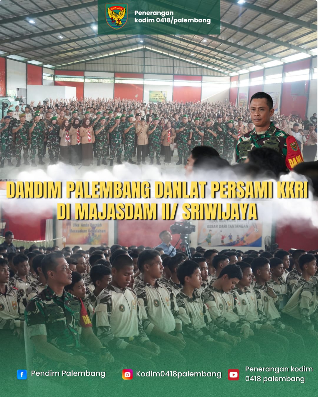 Komandan Kodim (Dandim) 0418/Palembang Letkol Arh Erik Novianto, S.Sos bertindak sebagai Komandan Latihan (Danlat) dalam kegiatan Perkemahan Sabtu Minggu (Persami) Korp Kadet Republik Indonesia (KKRI) yang digelar di Majasdam II/Sriwijaya, Sabtu (1/11/2025).