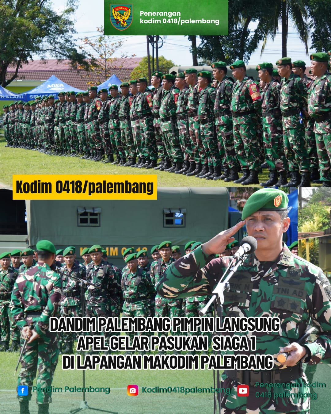 Komandan Kodim 0418/Palembang Letkol Arh Erik Novianto ,S.Sos memimpin langsung Apel Gelar Pasukan Siaga 1 yang dilaksanakan di Lapangan Makodim 0418/Palembang, Sabtu (07/03/2026).