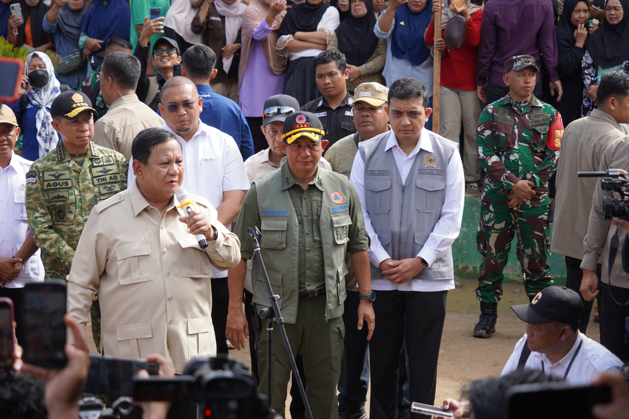 Presiden Prabowo Subianto didampingi rombongan yang terdiri dari Menteri Sekretaris Negara Prasetyo Hadi, Seskab Teddy Indra Wijaya, Menteri Dalam Negeri Tito Karnavian, Menteri Pertahanan Sjafrie Sjamsoeddin, Menteri Ketenagakerjaan Bahlil Lahadalia, Panglima TNI Jenderal TNI Agus Subiyanto, Kapolri Jenderal Polisi Listyo Sigit Prabowo, dan Kepala BNPB Suharyanto.