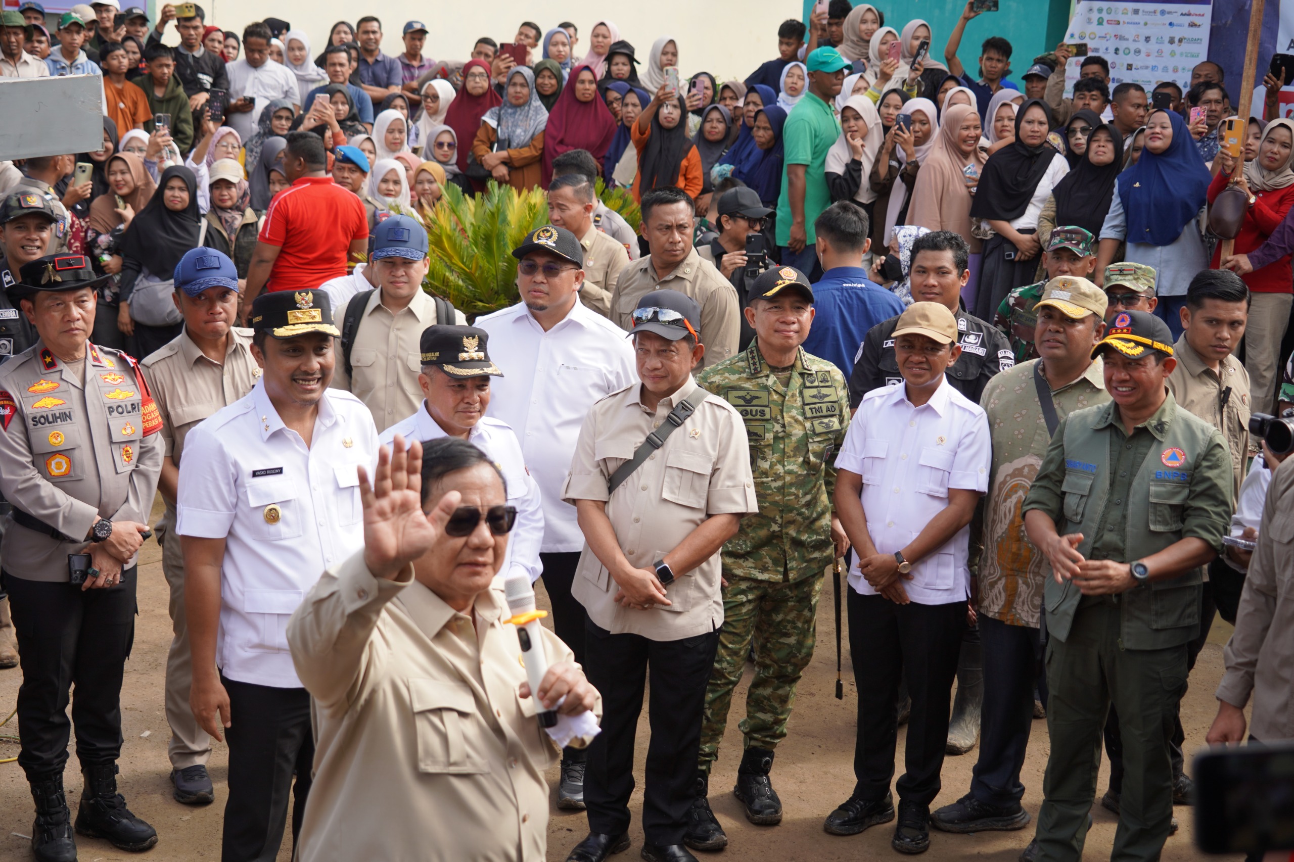 Presiden Prabowo Subianto didampingi rombongan yang terdiri dari Menteri Sekretaris Negara Prasetyo Hadi, Seskab Teddy Indra Wijaya, Menteri Dalam Negeri Tito Karnavian, Menteri Pertahanan Sjafrie Sjamsoeddin, Menteri Ketenagakerjaan Bahlil Lahadalia, Panglima TNI Jenderal TNI Agus Subiyanto, Kapolri Jenderal Polisi Listyo Sigit Prabowo, dan Kepala BNPB Suharyanto.