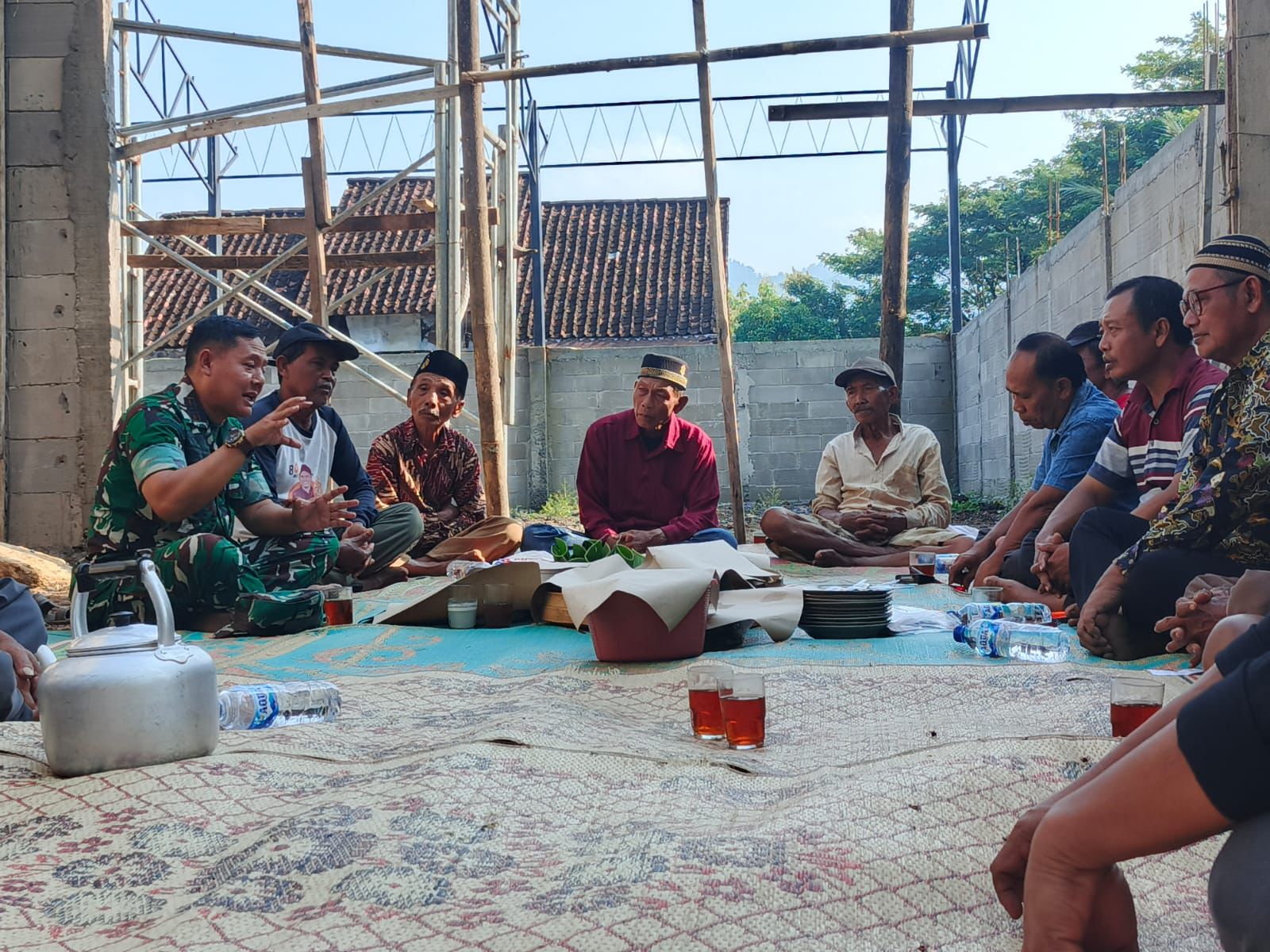 Sementara itu, setelah kegiatan doa bersama selesai, warga langsung melanjutkan proses pembangunan gedung secara gotong royong. Perangkat desa, masyarakat, hingga Babinsa tampak kompak terlibat dalam pengerjaan.