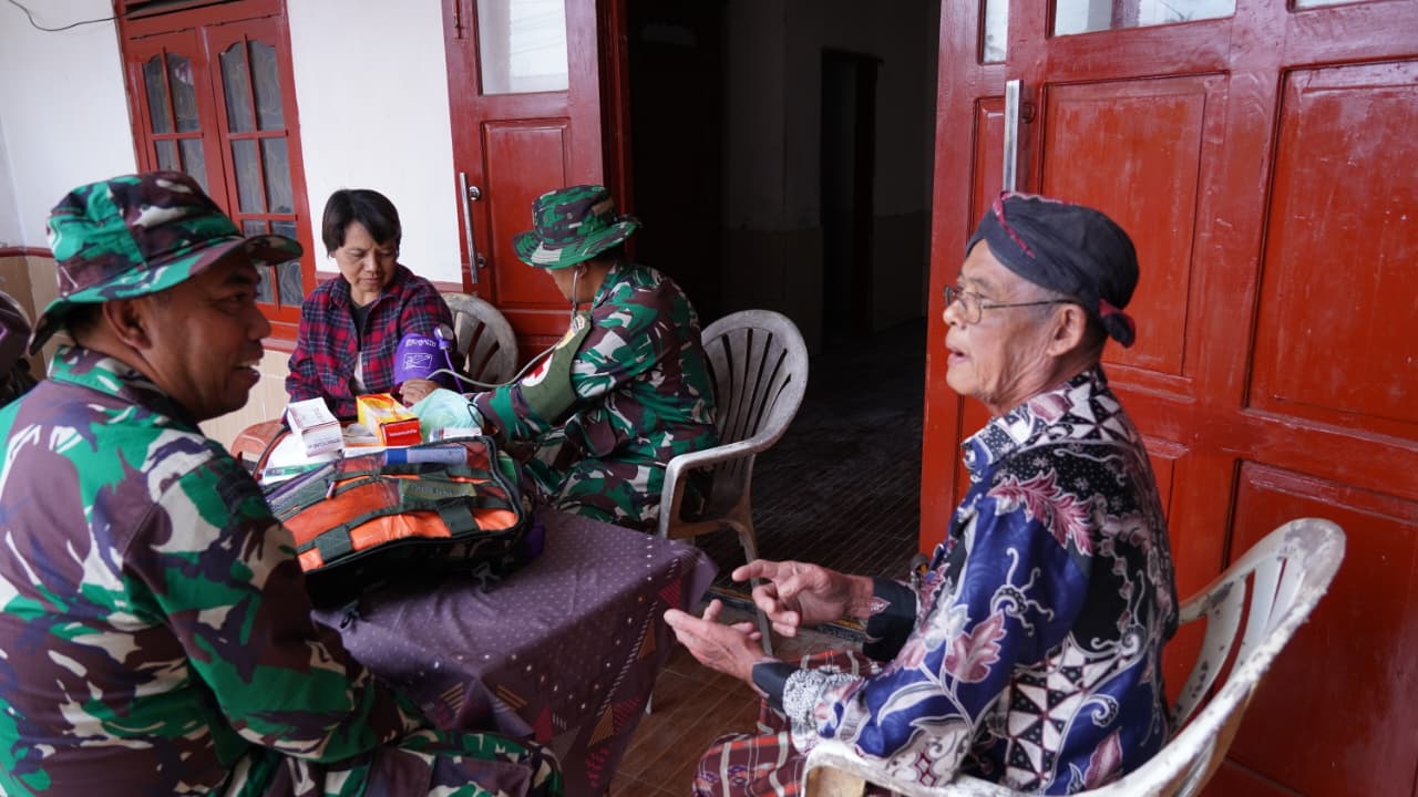 Dengan cara door to door Personil kesehatan menyisiri sudut jalan, bersilahturahmi dengan warga dan berdialog dengan warga tentang keluhan kesehatan. Hal itu dilakukan oleh Personil kesehatan yang tergabung dalam Satgas TMMD Ke-127 Tahun 2026 di Wilayah Kodim 0808/Blitar, Kamis (19/2/2026).