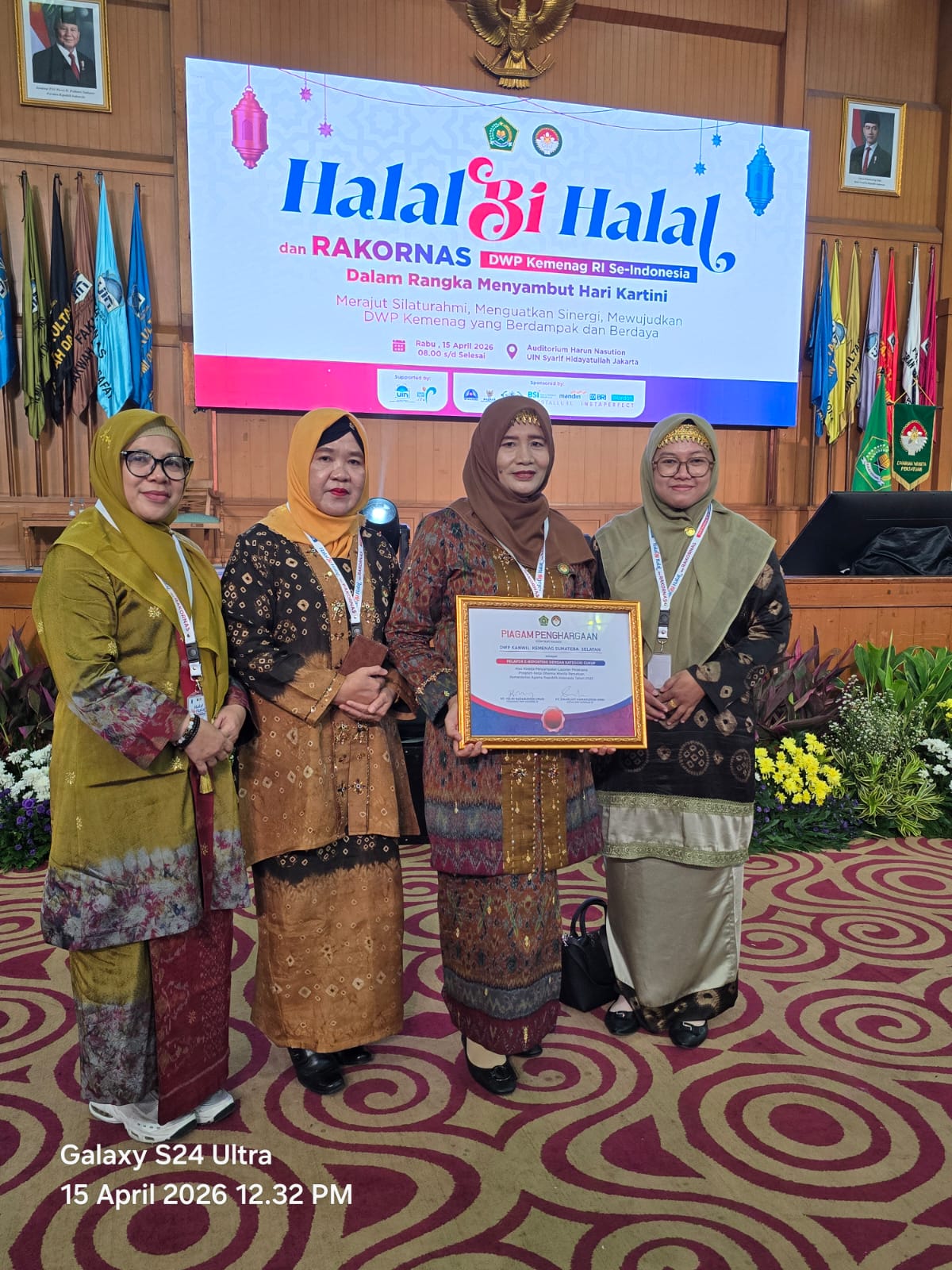 Penghargaan bergengsi tersebut diserahkan secara resmi oleh Penasihat DWP Kemenag RI Helmi Halimatul Udhmah dalam acara Rapat Koordinasi Nasional (Rakornas) DWP Kemenag se-Indonesia di UIN Syarif Hidayatullah Jakarta, Rabu (15/04/2026). Kegiatan ini juga dihadiri Menteri Agama Nasaruddin Umar.