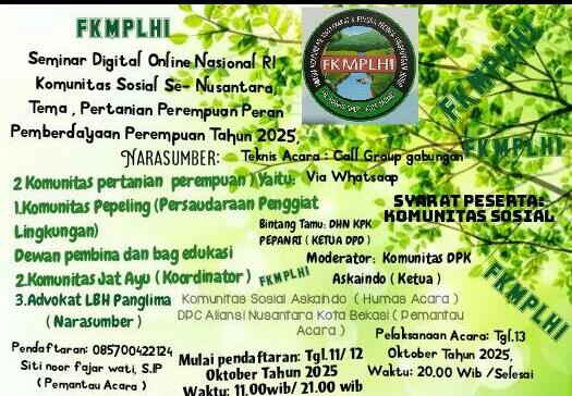 FKMPLHI (Forum Komunikasi Masyarakat Pencinta Lingkungan Hidup) Sumatra Barat mengadakan Seminar Digital Online Nasional RI yang dihadiri oleh berbagai komunitas sosial se-Nusantara Tema Pertanian perempuan peran pemberdayaan perempuan Berikut beberapa detail tentang acara tersebut.