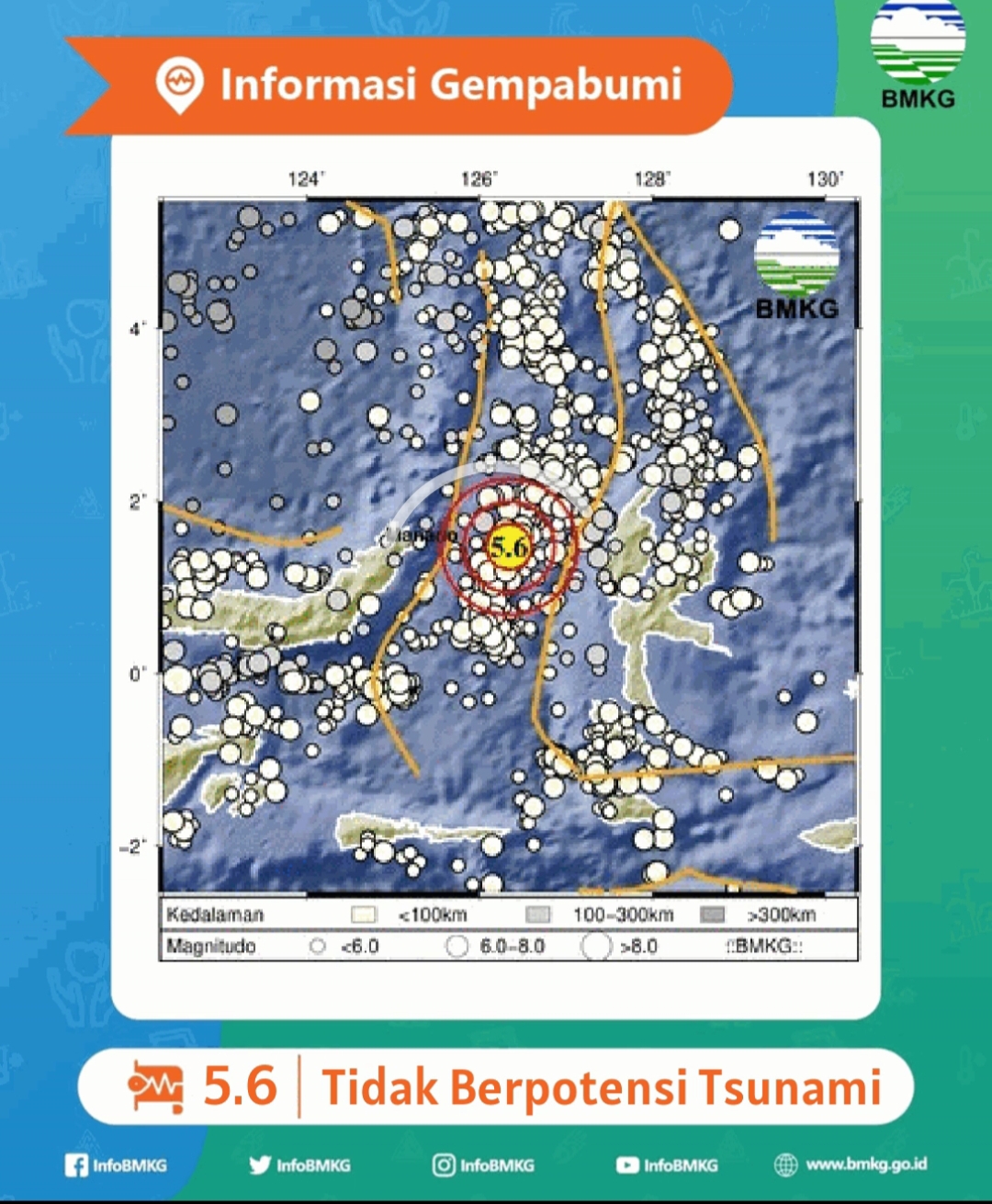 Pastikan informasi resmi hanya bersumber dari BMKG yang disebarkan melalui kanal komunikasi resmi yang telah terverifikasi (Instagram/Twitter @infoBMKG), website (http://www.bmkg.go.id atau inatews.bmkg.go.id), telegram channel (https://t.me/InaTEWS_BMKG) atau melalui Mobile Apps (IOS dan Android): wrs-bmkg atau infobmkg.