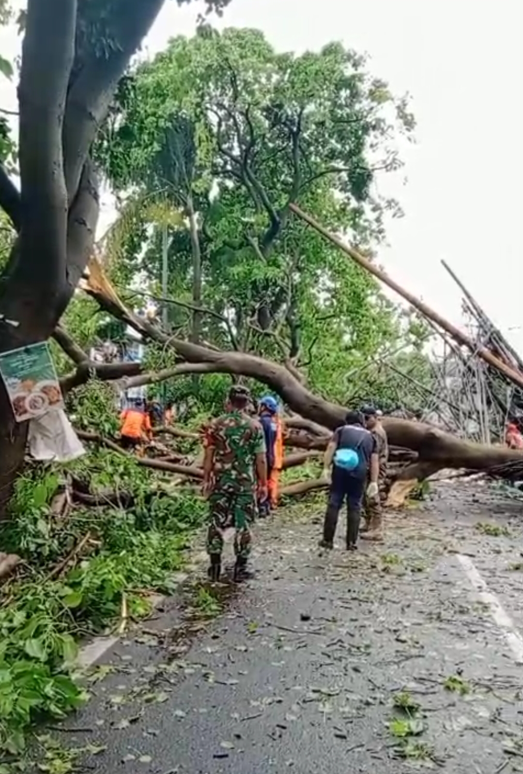 Pohon tumbang itu menutup badan jalan, sementara sebuah tiang listrik di kawasan tersebut juga nyaris roboh, sehingga sempat menghambat akses lalu lintas.