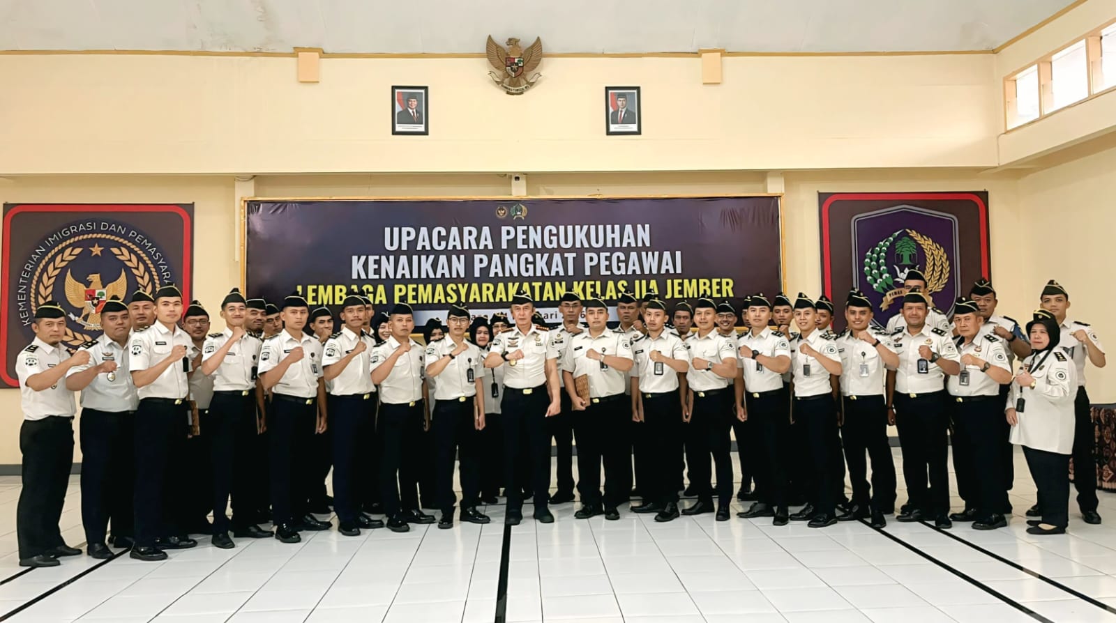 Lembaga Pemasyarakatan (Lapas) Kelas IIA Jember laksanakan pengukuhan kenaikan pangkat pegawai, pada Selasa (24/02/2026). Sebanyak dua belas orang pegawai menerima kenaikan pangkat dari Pengatur Muda Tingkat I (II/b) menjadi Penata Muda (III/a) berdasarkan Surat Keputusan Menteri Imigrasi dan Pemasyarakatan tentang Kenaikan Pangkat Pegawai Negeri Sipil.