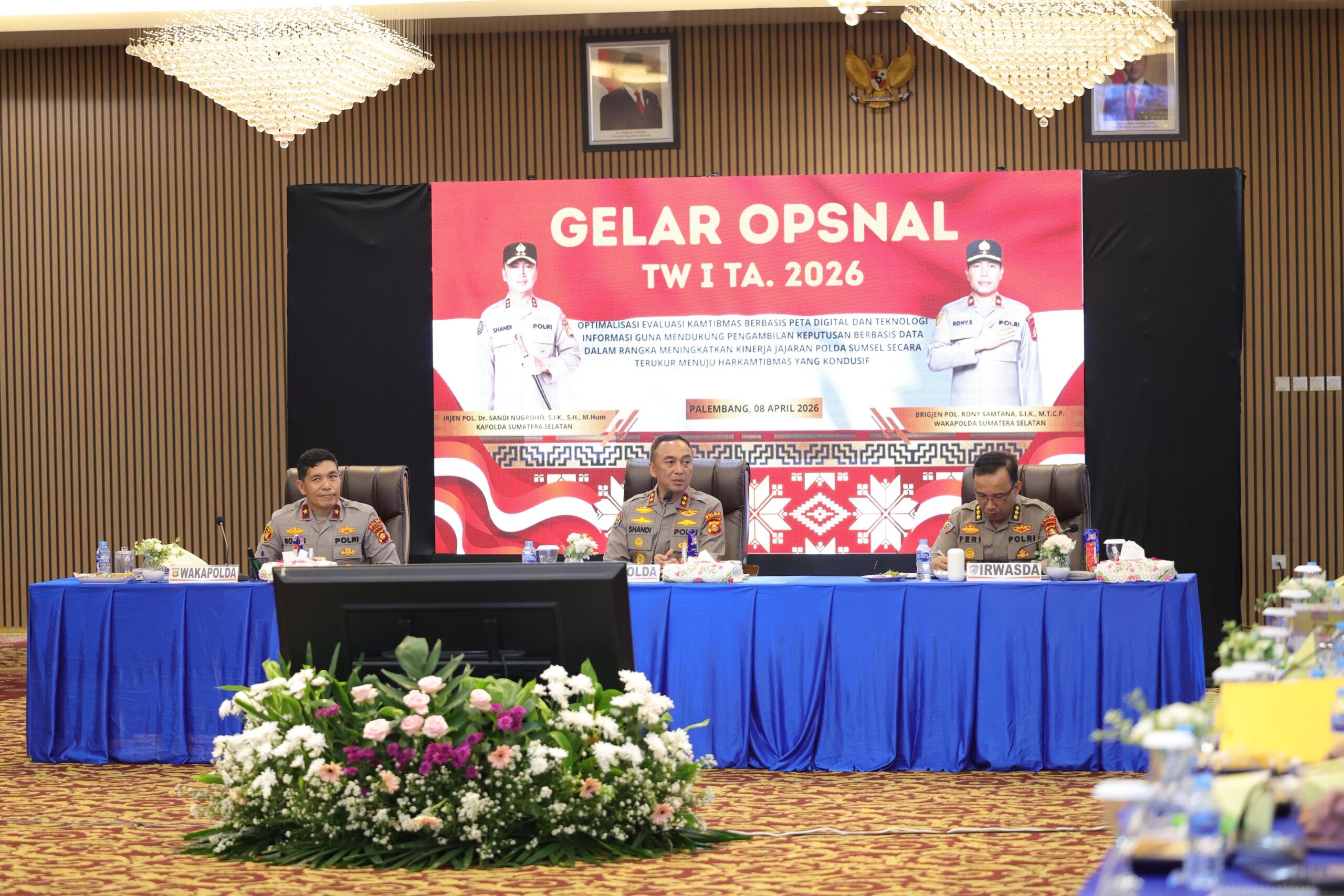 Polda Sumatera Selatan melaksanakan evaluasi kinerja secara terbuka melalui Gelar Operasional Triwulan I Tahun Anggaran 2026 yang dipimpin langsung oleh Sandi Nugroho di Gedung Presisi Mapolda Sumsel, Rabu (8/4/2026).