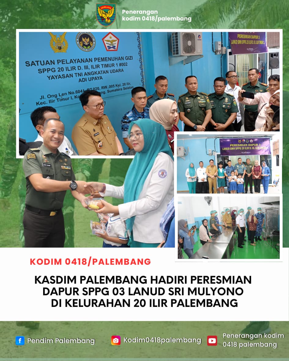 Dandim 0418/Palembang yang diwakili Kasdim Letkol Inf Dery Septriandi, S.T., M.M., M.Han menghadiri peresmian Dapur Satuan Pelayanan Pemenuhan Gizi (SPPG) 03 Lanud Sri Mulyono Herlambang di Kelurahan 20 Ilir D III, Kecamatan Ilir Timur I, Palembang, Selasa (24/2/2026).