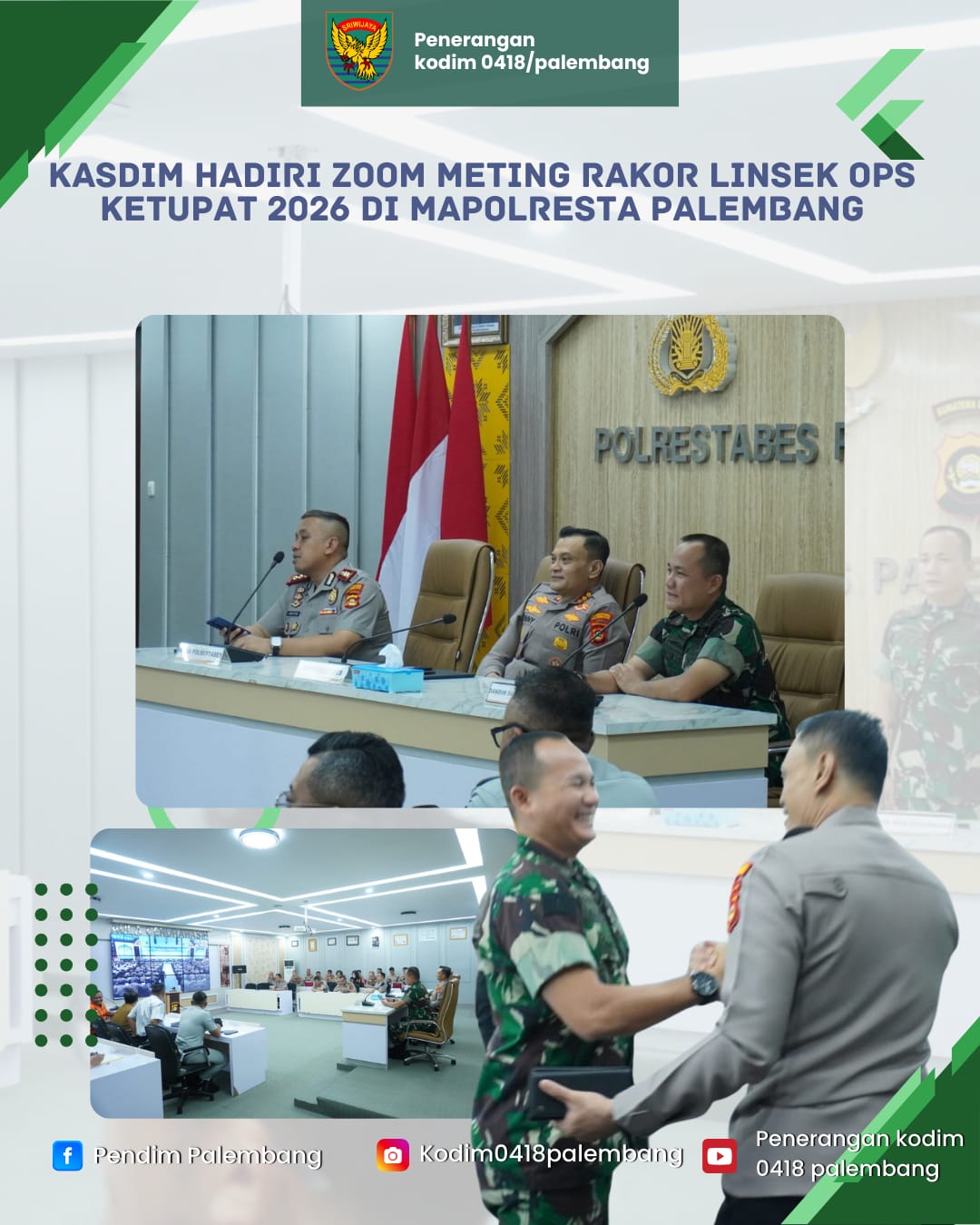 Dandim 0418/Palembang yang diwakili Kasdim Letkol Inf Dery Septriandi, S.T., M.M., M.Han, menghadiri kegiatan Zoom Meeting Rapat Koordinasi Lintas Sektoral (Rakor Linsek) Operasi Ketupat 2026 yang digelar di Mapolresta Palembang, Senin (2/3/2026).