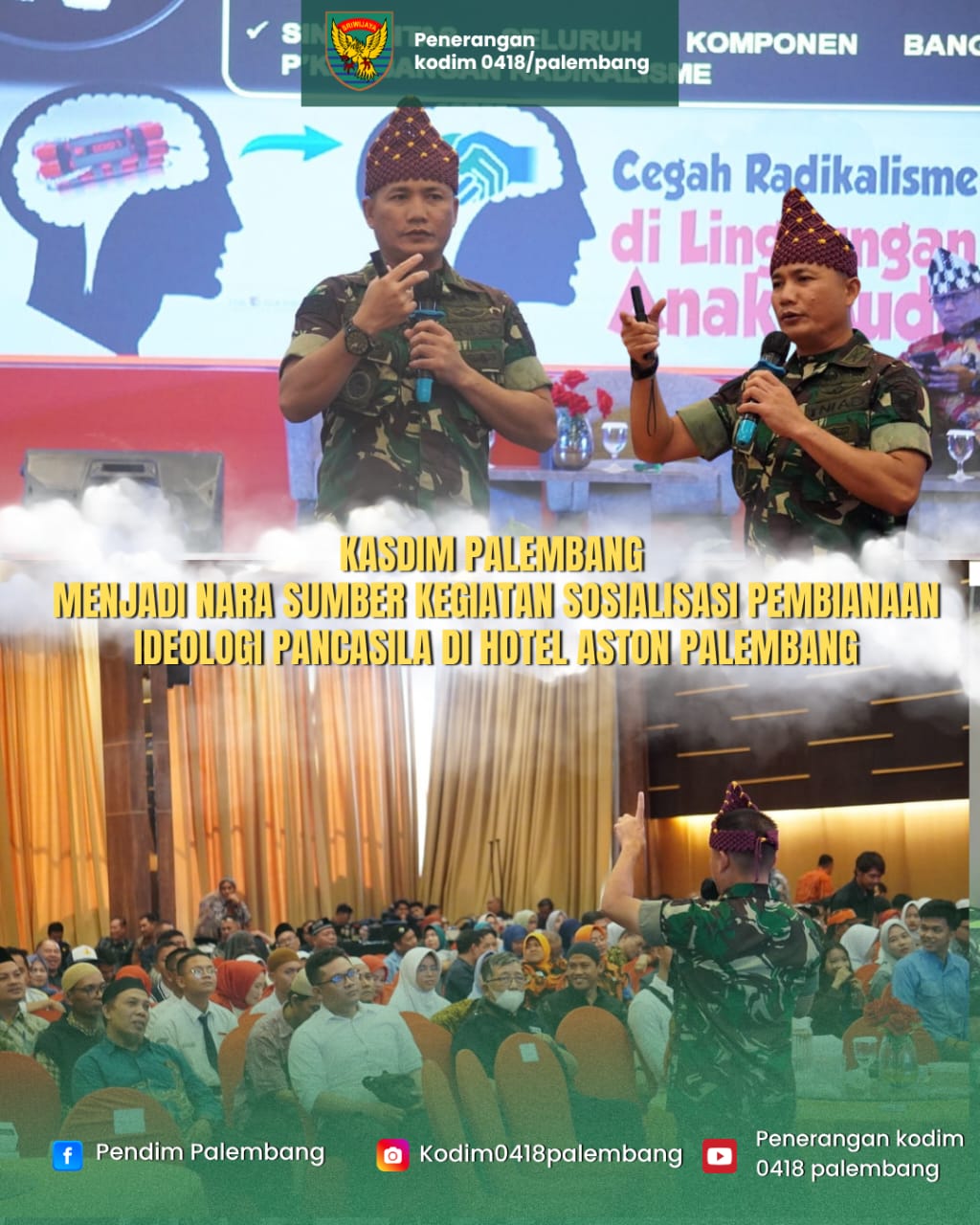 Kodim 0418/Palembang Hadir dalam kegiatan tersebut sejumlah pejabat penting dan narasumber, di antaranya Kol. CPL. Gusra Muttaqin, M.I.Kom – Koorwil Palembang BINDA Sumsel (Narasumber) Ichsanul Akmal, S.Sos., M.Si – Asisten Bidang Pemerintahan dan Kesra Setda Kota Palembang Prof. Dr. H. M. Alfajri Zabidi, M.M., M.Pd.I – Kepala Badan Kesbangpol Provinsi Sumsel,Letkol Inf Dery Septriandi, S.T., M.M., M.Han – Kasdim 0418/Palembang (Narasumber),Ustadz Abdurrahman Thaib Mantan Napiter (Narasumber),Kombes Pol I.G.A. Dwi Perbaya, S.I.K., M.Si – Kasatgaswil Densus 88 AT Polri Sumsel (Narasumber),Rudi Indawan, S.H., M.Kn – Kepala Badan Kesbangpol Kota Palembang,H. Aprizal Hasyim, S.Sos., M.M. – Sekda Kota Palembang.