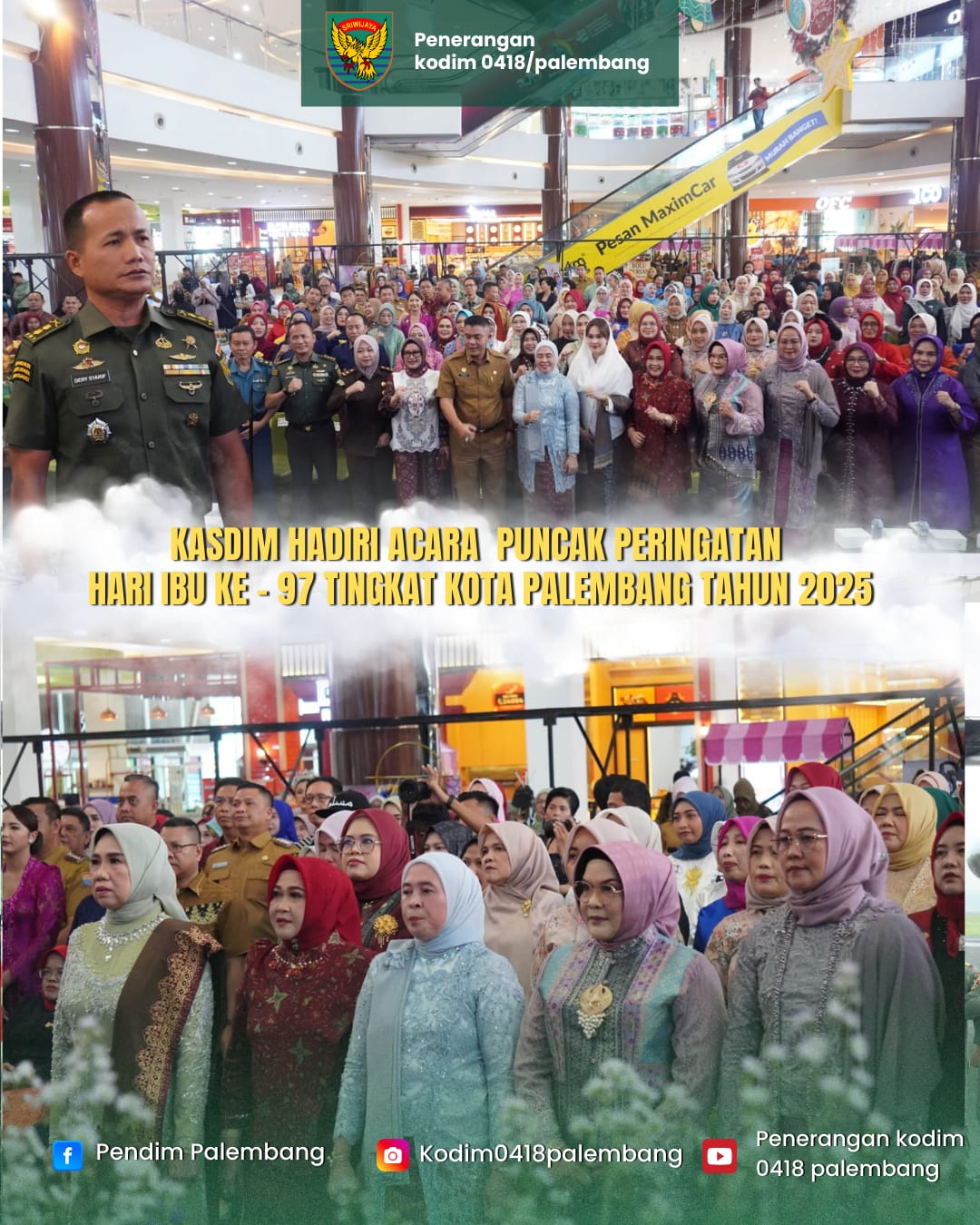 Komando Distrik Militer (Kodim) 0418/Palembang turut menghadiri acara puncak peringatan Hari Ibu ke-97 Tahun 2025 tingkat Kota Palembang. Kegiatan ini diwakili oleh Kasdim 0418/Palembang Letkol Inf Dery Septriandi, S.T.,M.M., M.Han yang hadir bersama jajaran Forkopimda Palembang di lokasi acara, Selasa (9/12/2025).