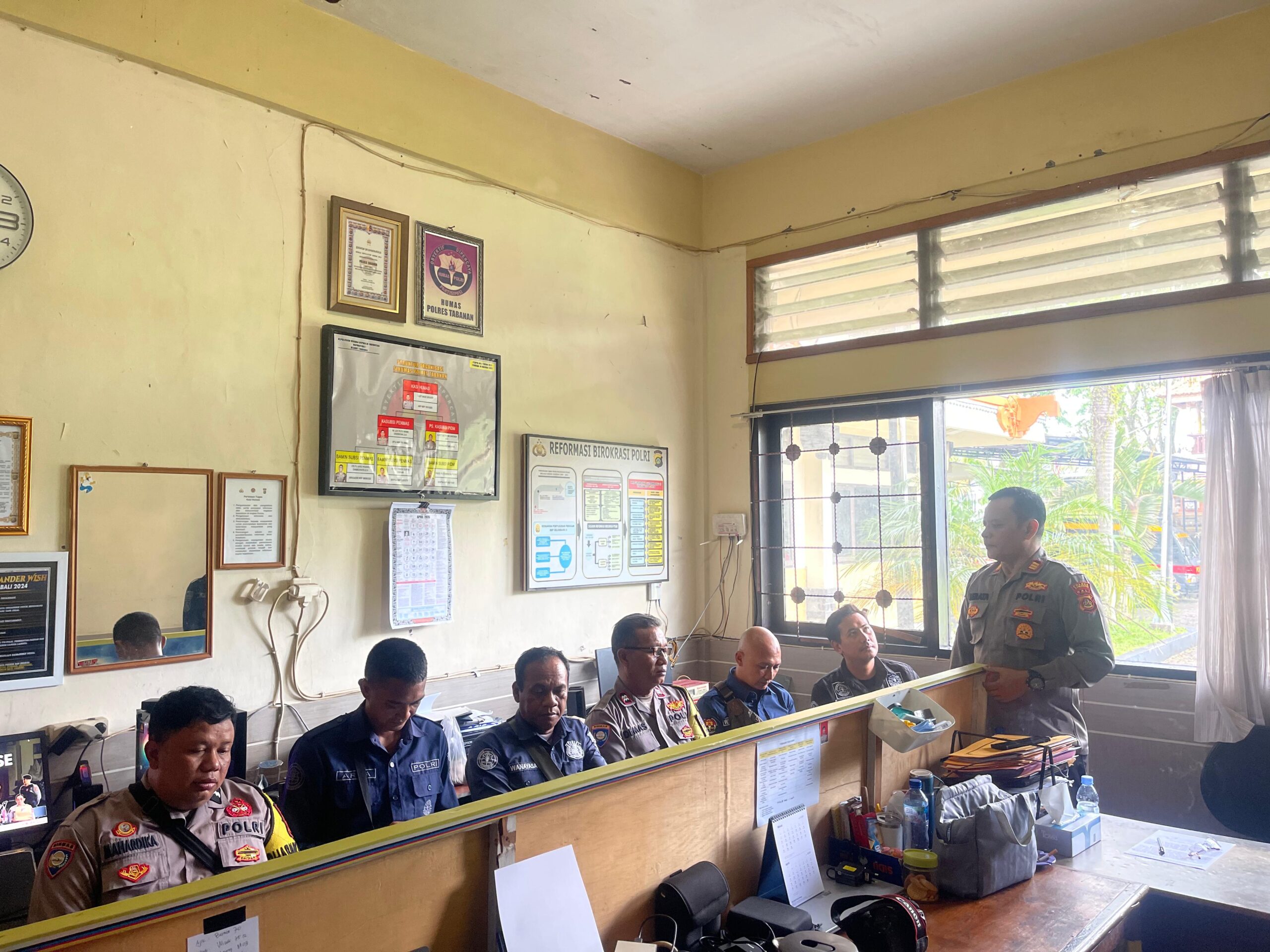 Kasi Humas Polres Tabanan AKP I Gusti Made Berata didampingi Kasubsi Penmas beserta Anggota Sihumas Polres Tabanan, memberikan arahan terkait pelaksanaan tugas kehumasan kepada jajaran, sebagai upaya meningkatkan kualitas penyampaian informasi kepada masyarakat. Kegiatan ini menekankan pentingnya peran humas dalam membangun citra positif institusi Polri di tengah perkembangan informasi yang semakin cepat.