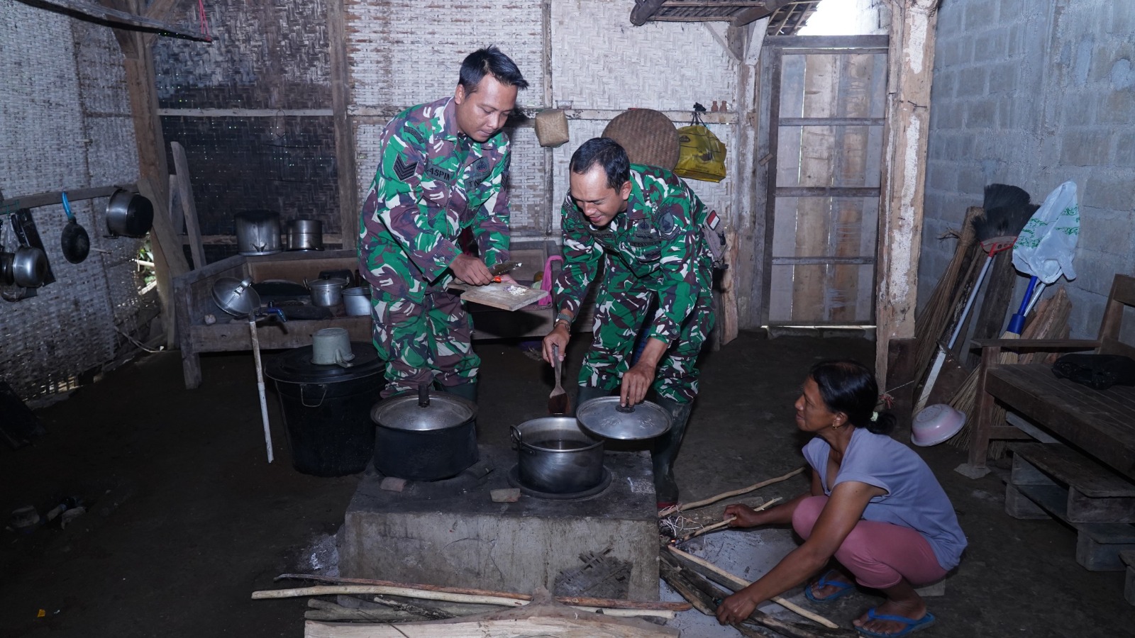 Mbah Lasini yang sehari-hari rumahnya di gunakan memasak untuk Personel Satgas TMMD 127 Kodim 0808/Blitar tampak senang dan gembira dengan kehadiran anggota Satgas yaitu Sertu Suparni dan Sertu Widodo yang turut membantunya memasak di dapur