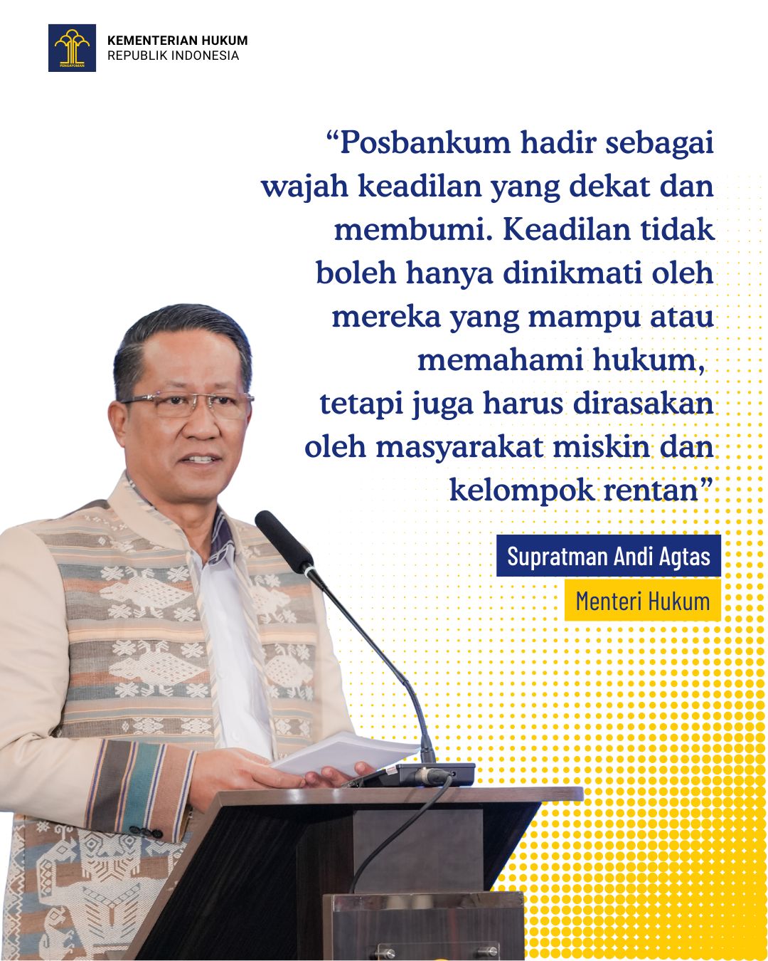Menurut Menteri Hukum Supratman Andi Agtas, Posbankum menjadi wajah keadilan yang dekat, membumi, dan mudah diakses masyarakat, terutama kelompok miskin dan rentan.