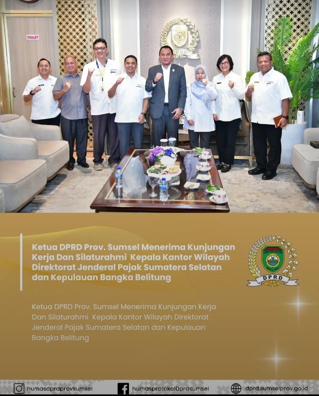 Ketua DPRD Provinsi Sumatera Selatan Andie Dinialdie menerima kunjungan kerja sekaligus silaturahmi Kepala Kantor Wilayah Direktorat Jenderal Pajak Sumatera Selatan dan Kepulauan Bangka Belitung dalam rangka memperkuat sinergi antara legislatif dan otoritas perpajakan.