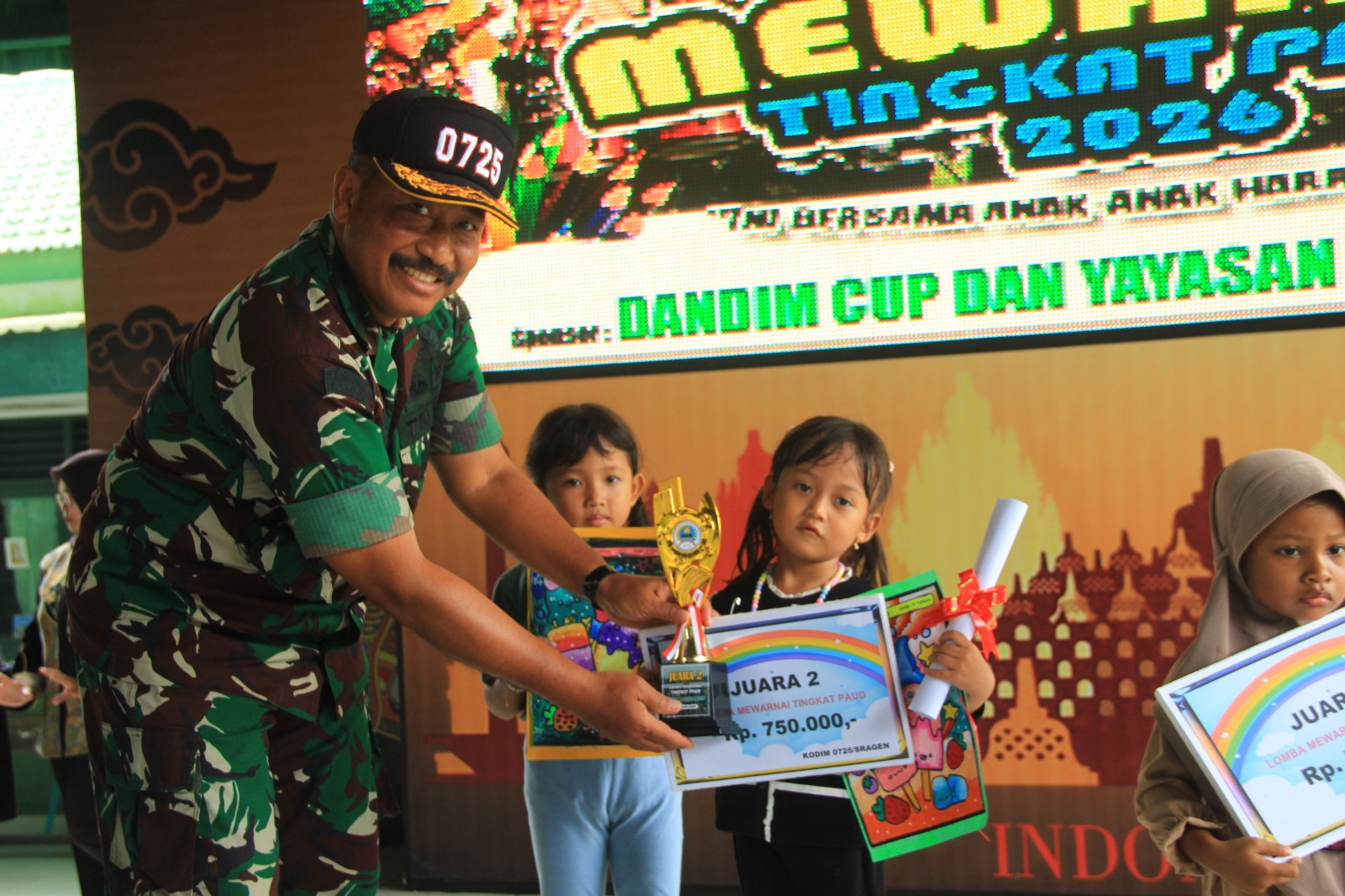 Agar lebih dekat dengan TNI, Kodim 0725/Sragen menggelar lomba mewarnai tingkat Paud di aula guyub rukun Makodim Sragen. Lomba Mewarnai Dandim cup dan Yayasan Kartika Jaya mengambil tema “TNI bersama anak anak harapan bangsa”. Sabtu, 07/02/2026.