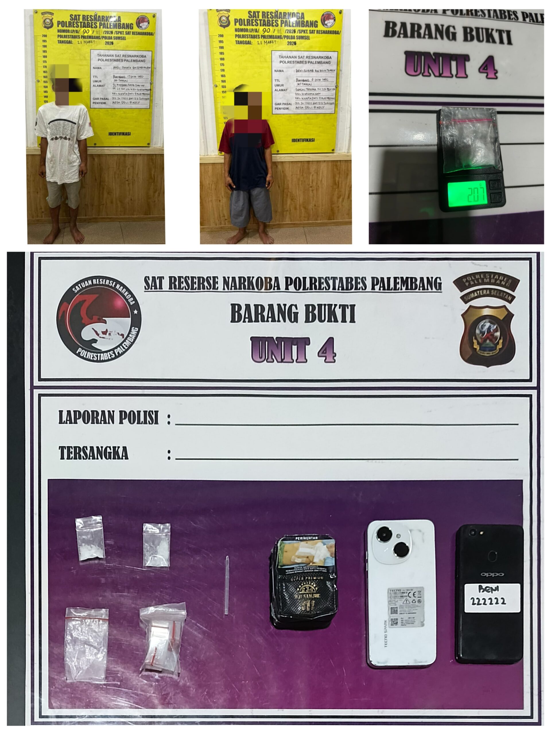 Kepolisian Daerah Sumatera Selatan melalui Satuan Reserse Narkoba Polrestabes Palembang kembali menunjukkan komitmen tegas dalam memberantas peredaran gelap narkotika dengan mengamankan dua orang tersangka berinisial AD (32) dan BR (30) di wilayah Jalan Mayjend Satibi Darwis, Kelurahan Keramasan, Kecamatan Kertapati, Kota Palembang, pada Jumat malam, 27 Maret 2026, sekira pukul 20.30 WIB.