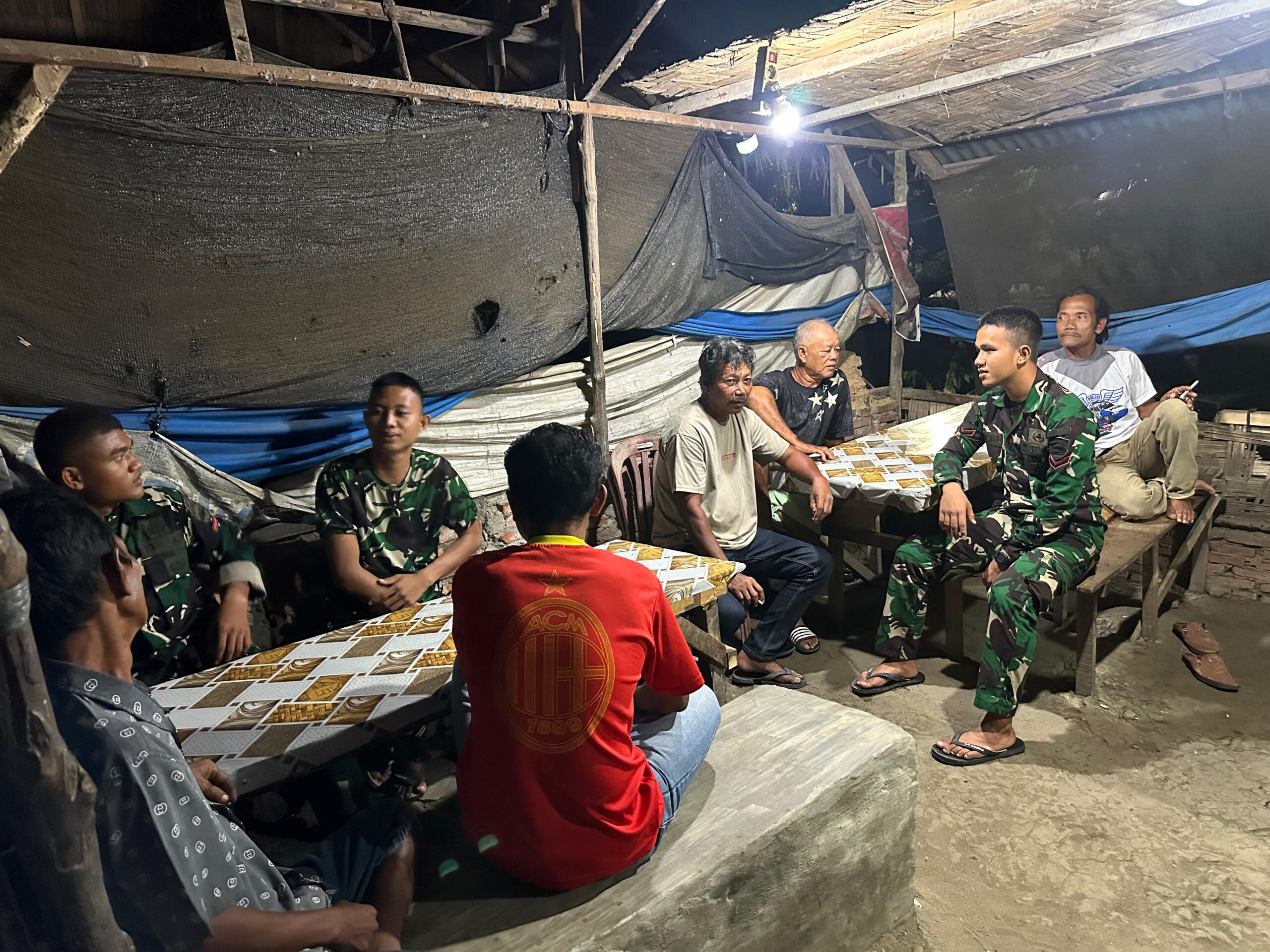 Empat prajurit Batalyon Teritorial Pembangunan (YON TP)907/Dewa Shahdan yang tergabung dalam Satgas TNI Manunggal Membangun Desa (TMMD) ke 128 Tahun 2026,Senin 27 April 2026 malam menyambangi sejumlah warga yang sedang minum kopi di warung Ibu Ernawati (49) di Desq Pasar Rawa Kec Gebang Kab Langkat.