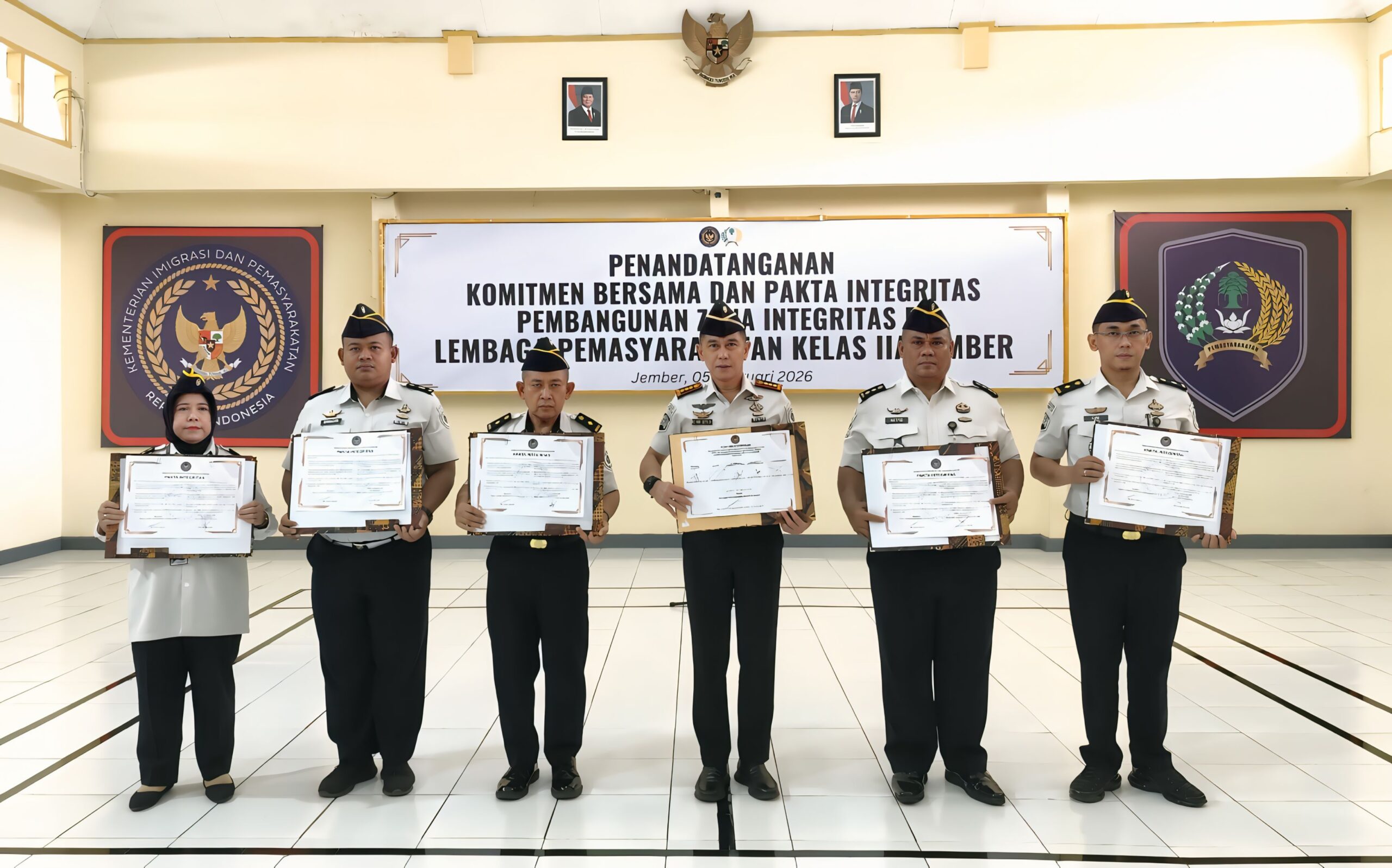 Lembaga Pemasyarakatan (Lapas) Kelas IIA Jember meneguhkan komitmen dalam membangun Zona Integritas menuju Wilayah Bebas dari Korupsi (WBK), melalui Penandatanganan Komitmen Bersama dan Pakta Integritas Tahun 2026. Pelaksanaan kegiatan diikuti oleh seluruh pegawai, bertempat di Aula Utama Lapas Kelas IIA Jember, pada Kamis (05/02/2026).