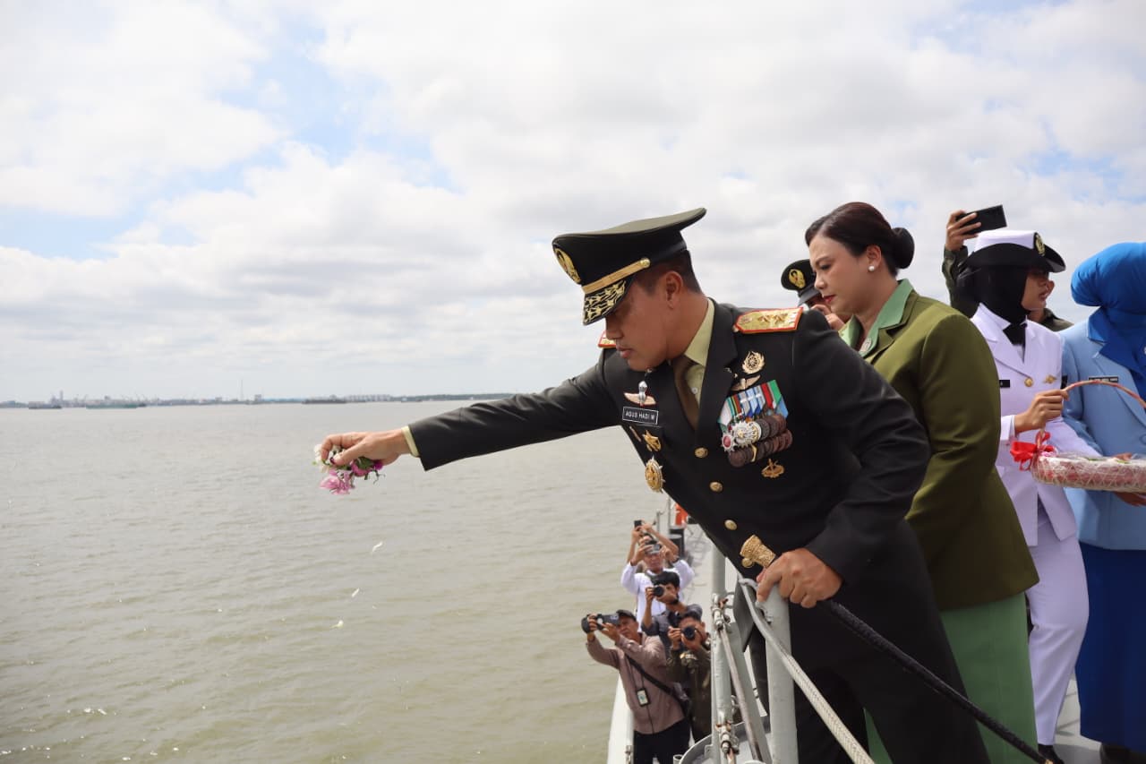 Dalam rangka memperingati Hari Pahlawan Nasional tahun 2025, Pangdam XIX/Tuanku Tambusai, Mayjen TNI Dr. Agus Hadi Waluyo, S.A.P., M.M., CHRMP., memimpin kegiatan tabur bunga di atas KRI Sultan Thaha Sayfuddin wilayah Perairan Dumai, Kec. Sungai Sembilan-Kota Dumai Provinsi Riau pada Senin (10/11/2025).