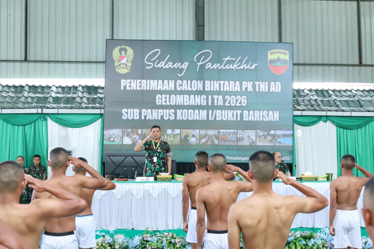 Pangdam I/Bukit Barisan Mayjen TNI Hendy Antariksa memimpin kegiatan Sidang Pantukhir Pusat Penerimaan Calon Bintara (Caba) PK TNI AD Gelombang I TA 2026 tingkat Sub Panpus Kodam I/BB di Lapangan Tennis Indoor Rindam I/BB, Pematangsiantar, Kamis (19/2/2026).