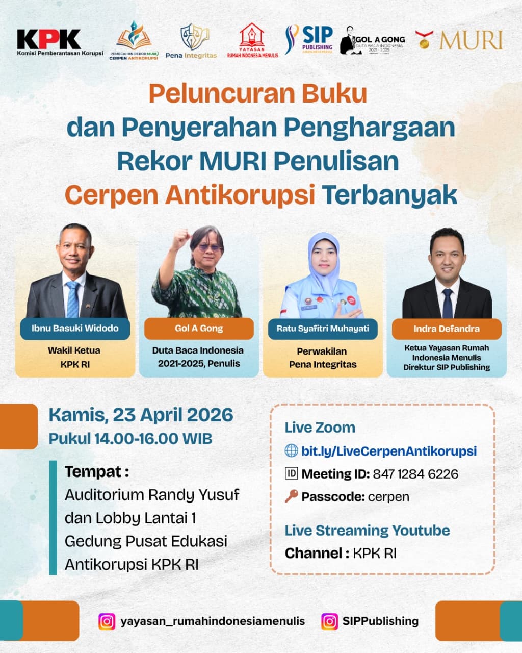 Sebanyak 1.581 cerpen antikorupsi berhasil dihimpun dan mencetak Rekor Museum Rekor-Dunia Indonesia (MURI) dalam kegiatan literasi nasional yang digelar di Auditorium Komisi Pemberantasan Korupsi RI, Kamis (23/4/2026).