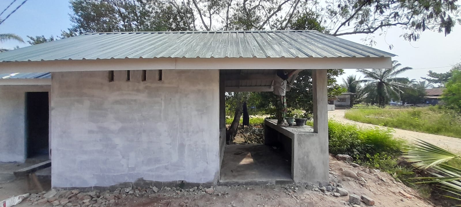 Meskipun hari libur Minggu 26 April 2026 pekerjaan pembangunan Poskamling tetap dilanjutkan.Cuaca panas dan hari libur bukan alasan bagi anggota Satgas untuk tidak terus membantu tukang dalam pengerjaan pembangunan Poskamling tersebut.