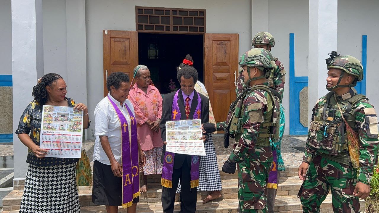 Dalam kesempatan tersebut, personel Satgas juga membagikan kalender kepada pihak Gereja GKI Yoska Yudea Benawa sebagai bentuk perhatian dan kebersamaan antara TNI dan masyarakat.