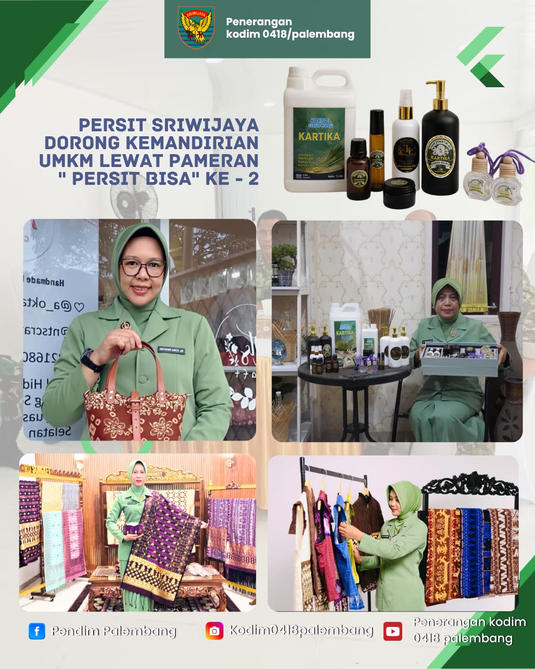 Pameran ini menghadirkan berbagai produk unggulan UMKM karya anggota Persit dari seluruh Indonesia. Khusus dari wilayah Sumatera Selatan, Persit KCK PD II/Sriwijaya menampilkan lima UMKM binaan terbaik, yakni RD Songket, Lidi Nipah, Kartika Sereh Wangi, Ragam Tapis Lampung, dan NTS Craft.