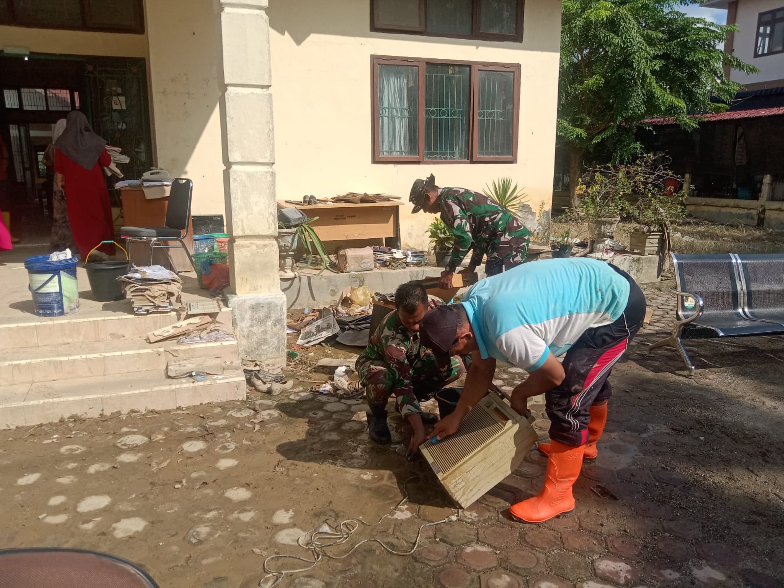 Dari pantauan di lokasi, terdapat tumpukan lumpur, dokumen basah, dan perlengkapan kantor yang rusak akibat terendam air. Para personel TNI bersama staf kecamatan terlihat membersihkan halaman, mengangkat barang-barang yang terendam, serta menjemur dokumen dan perlengkapan yang masih dapat diselamatkan.