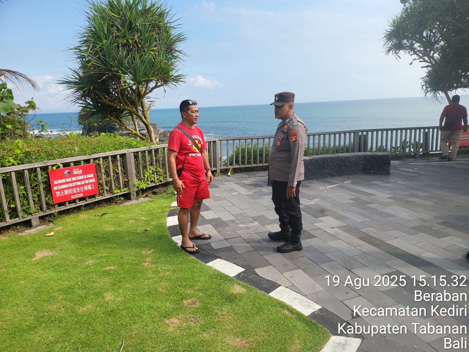 Hari Senin, 16-2-2026 pukul 13.00 s/d 15.00 wita, personil Polsubsektor Tanah Lot Bripka I Made Subargayasa dan Brigadir I Wayan Kertayasa di backup personil opsnal Polsek Kediri bersinergi dengan satuan pengamanan kawasan DTW Tanah Lot dan pecalang melaksanakan patroli di kawasan baik lokasi parkir, Artshop dan pantai.