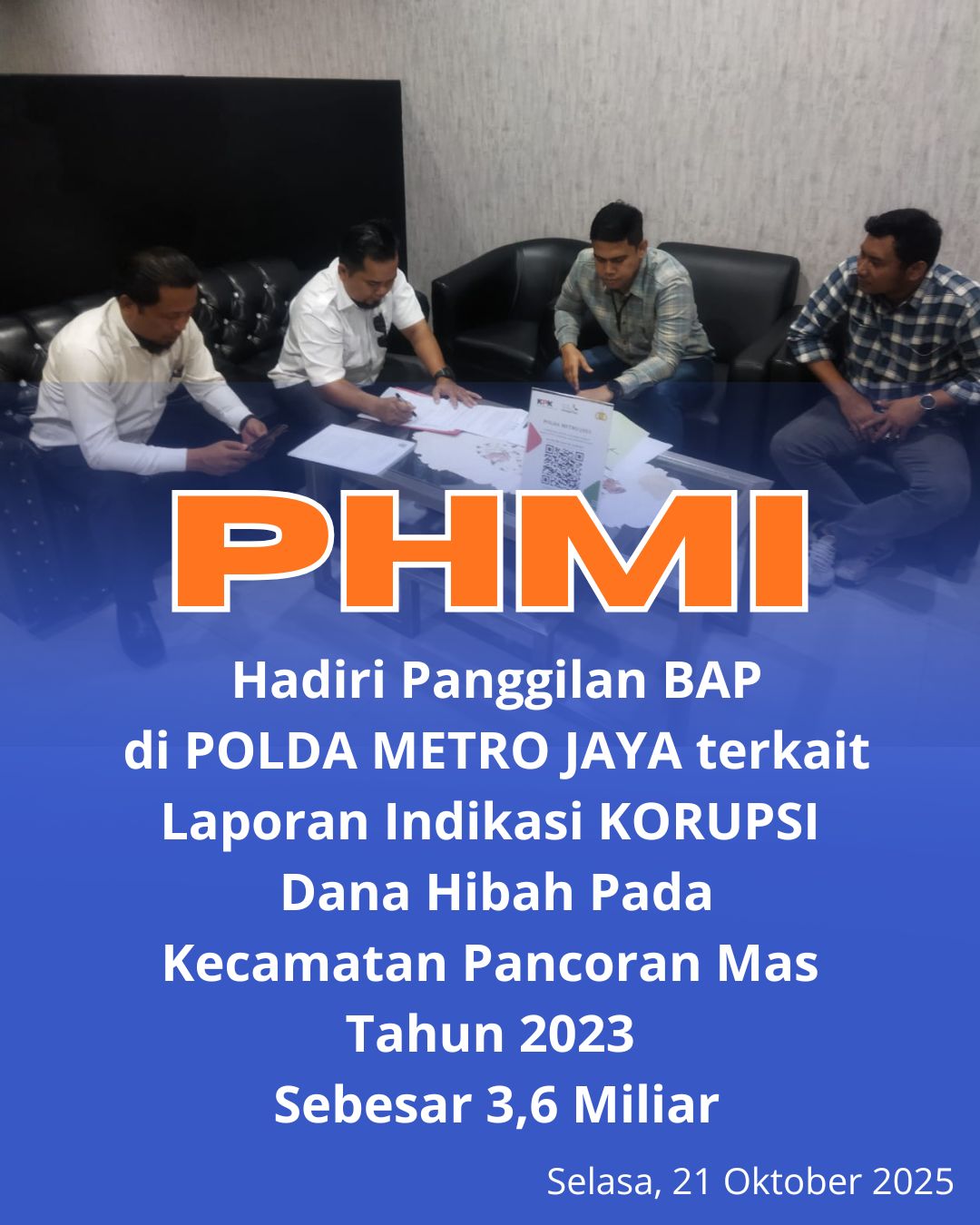 PHMI hadir mengikuti seluruh agenda pemeriksaan sebagai pelapor di gedung Ditreskrimsus Polda metro jaya (21/10/25). Secara resmi melaporkan Kecamatan Pancoran Mas Kota Depok, ke Direktorat Reserse Kriminal Khusus Polda Metro Jaya terkait Belanja Hibah Kepada Badan, Lembaga, Organisasi Kemasyarakatan yang Berbadan Hukum Indonesia Pada Tahun 2023 Sebesar Rp.3.608.825.000. (Tiga Miliar Enam Ratus Delapan Juta Delapan Ratus dua puluh lima ribu rupiah).