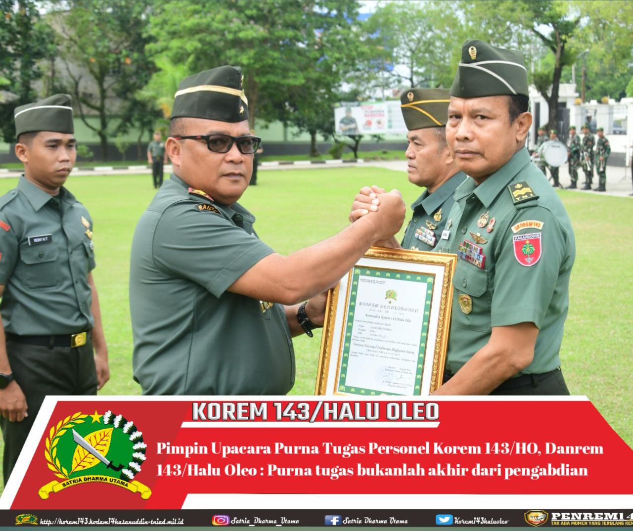 Upacara tradisi purna tugas berlangsung khidmat dan diikuti oleh Kasrem, para Kasi Kasrem, Kabalak aju dan Kabalk Rem, perwira, bintara, tamtama serta PNS Korem 143/HO. Dalam kesempatan tersebut, Danrem 143/HO memberikan piagam penghargaan kepada personel yang memasuki masa purna tugas sebagai simbol penghormatan atas pengabdian yang telah diberikan.