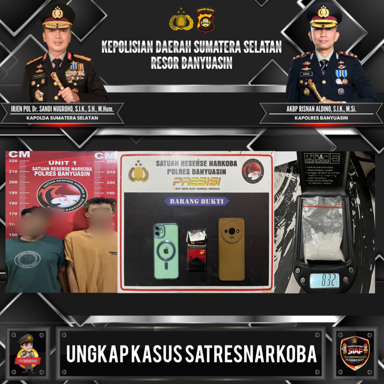 Satuan Reserse Narkoba Polres Banyuasin kembali mengungkap kasus peredaran narkotika dengan menangkap dua tersangka dalam operasi tangkap tangan di Lingkungan I Sukajadi, Kelurahan Sukajadi, Kecamatan Talang Kelapa, Kabupaten Banyuasin, Kamis malam, 9 April 2026, sekira pukul 22.00 WIB.