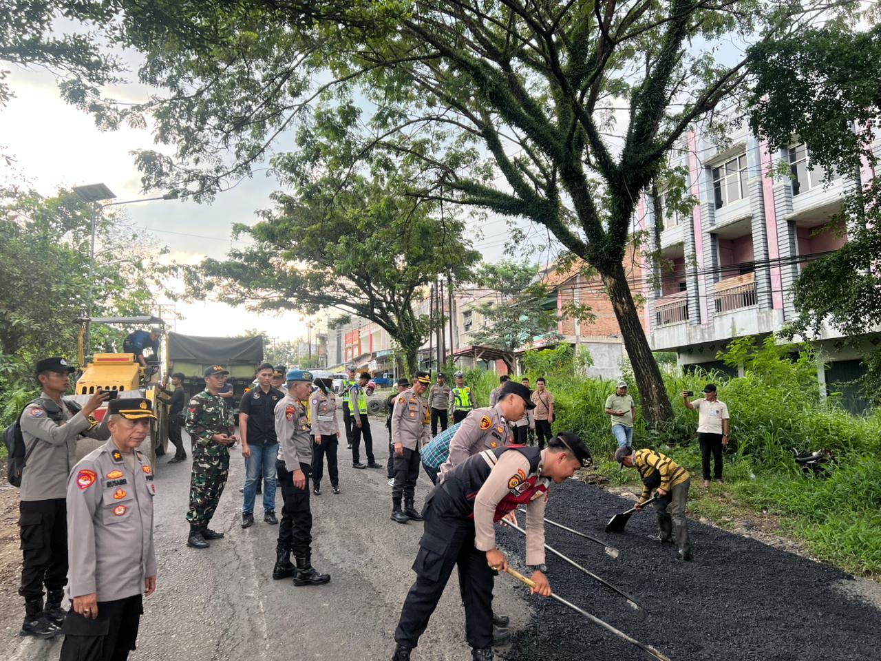 Polres Ogan Komering Ulu bersama instansi lintas sektor melakukan penambalan jalan berlubang dan kegiatan bersih lingkungan di Jalan Ganesya Terminal Batu Kuning, Kecamatan Baturaja Barat, Jumat (13/3/2026).